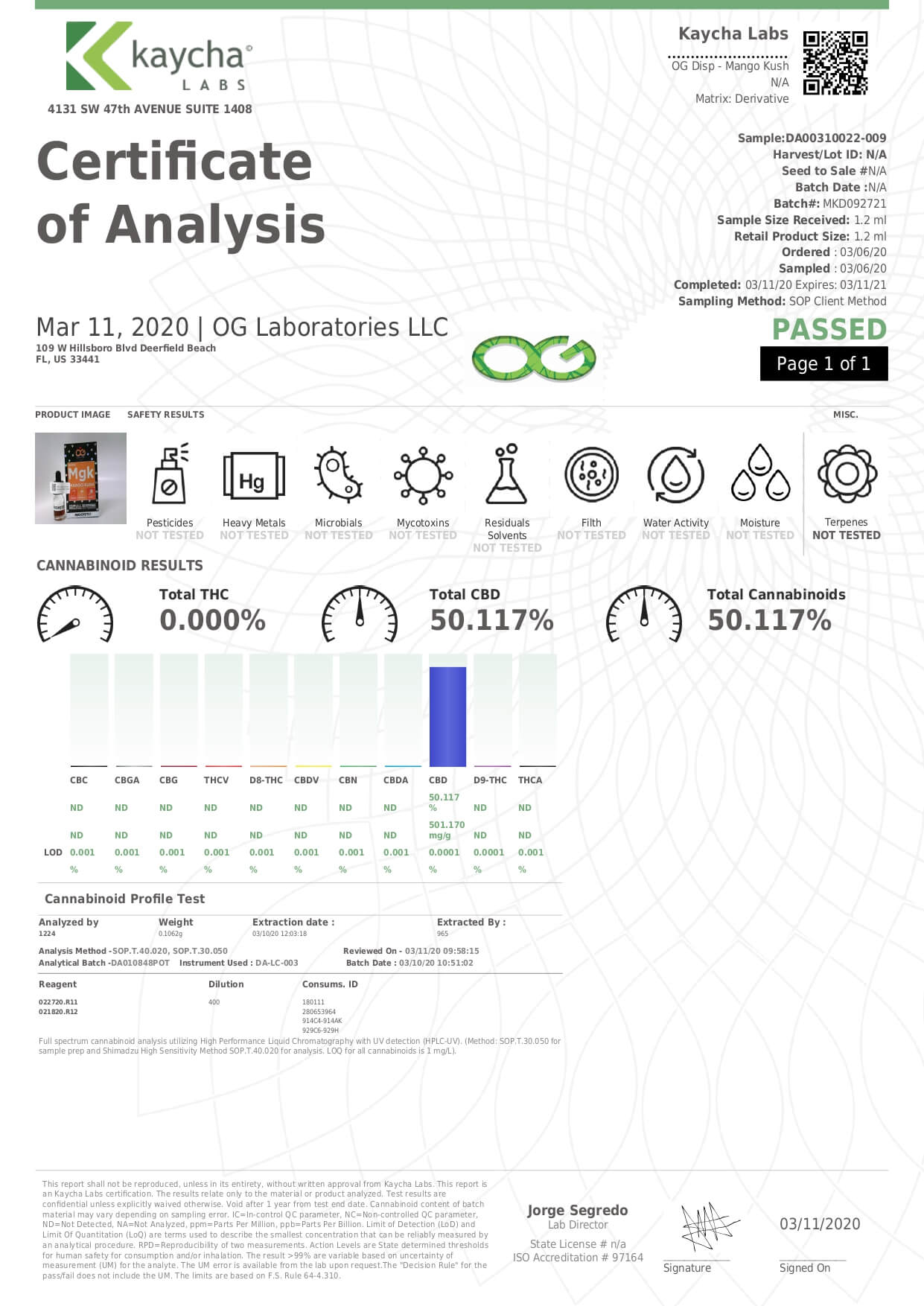 OG Labs CBD Vape Full Spectrum Mango Kush Disposable Pen Lab Report important details about vaping products.