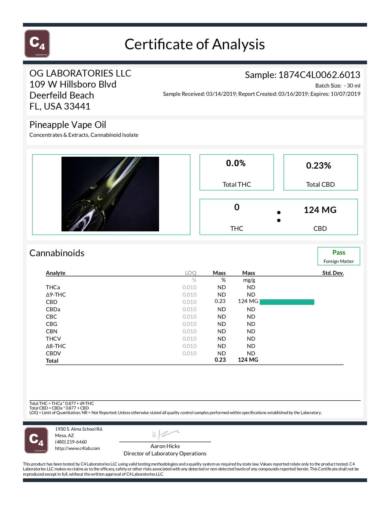 OG Labs CBD Vape Juice Pineapple Lab Report important details about vaping products.