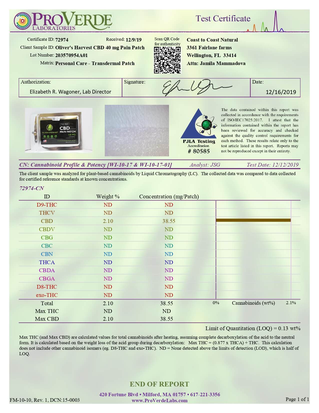 Oliver's Harvest CBD Topical Menthol Pain Patch Lab Report