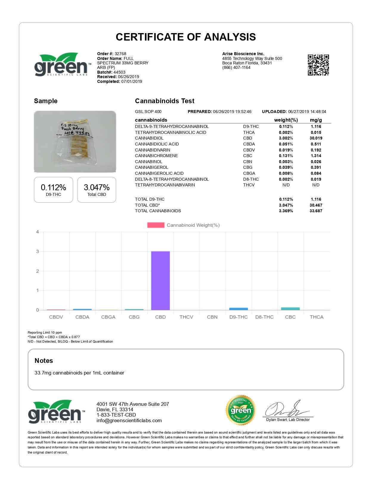 Original Hemp CBD Tincture Fresh Berry 33mg Lab Report