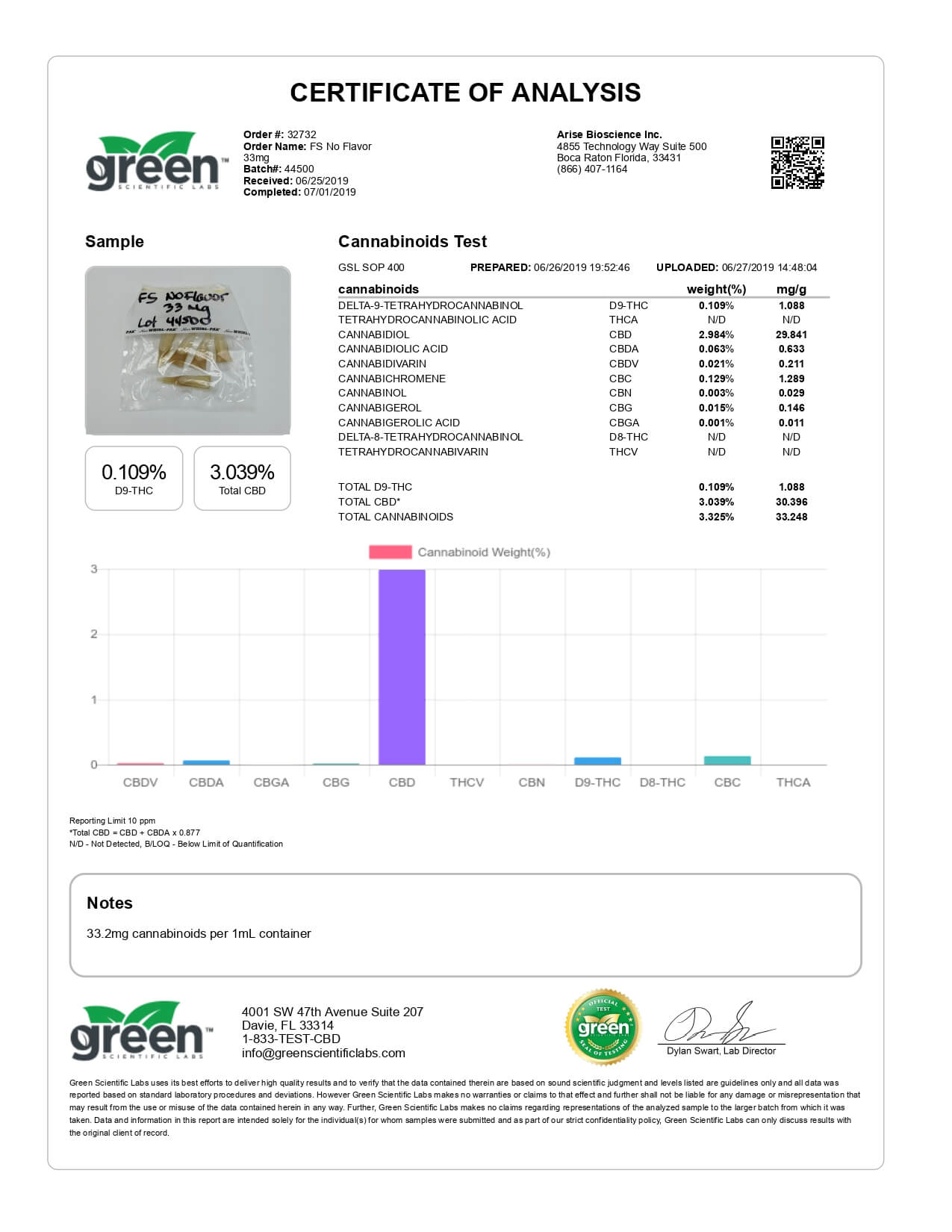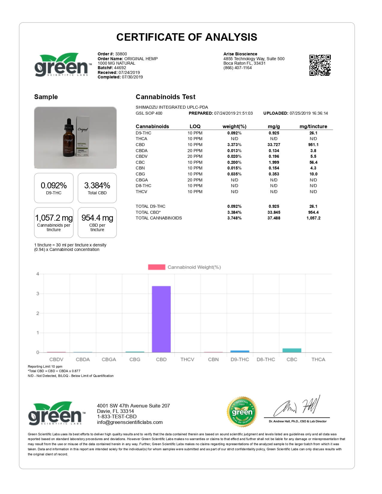 Original Hemp CBD Tincture Natural 33mg Lab Report