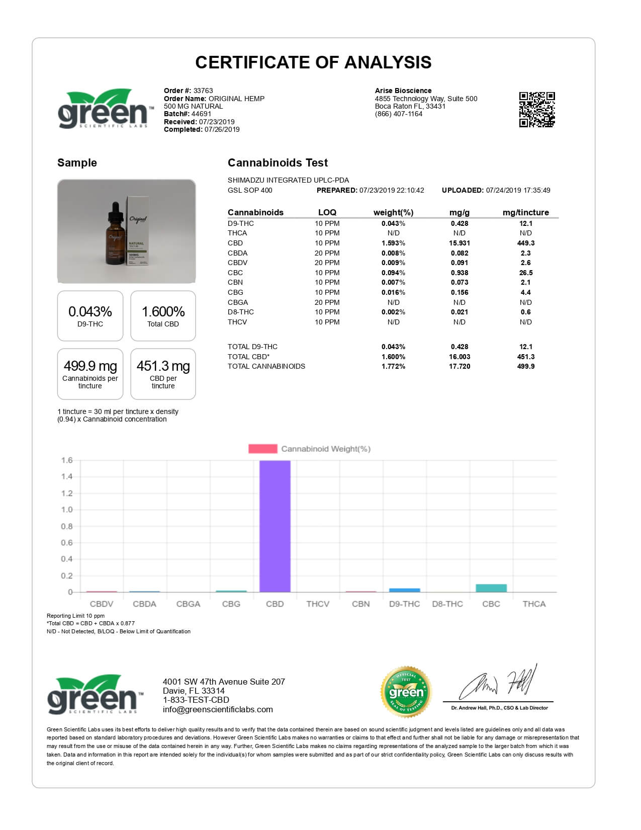 Original Hemp CBD Tincture Natural Lab Report