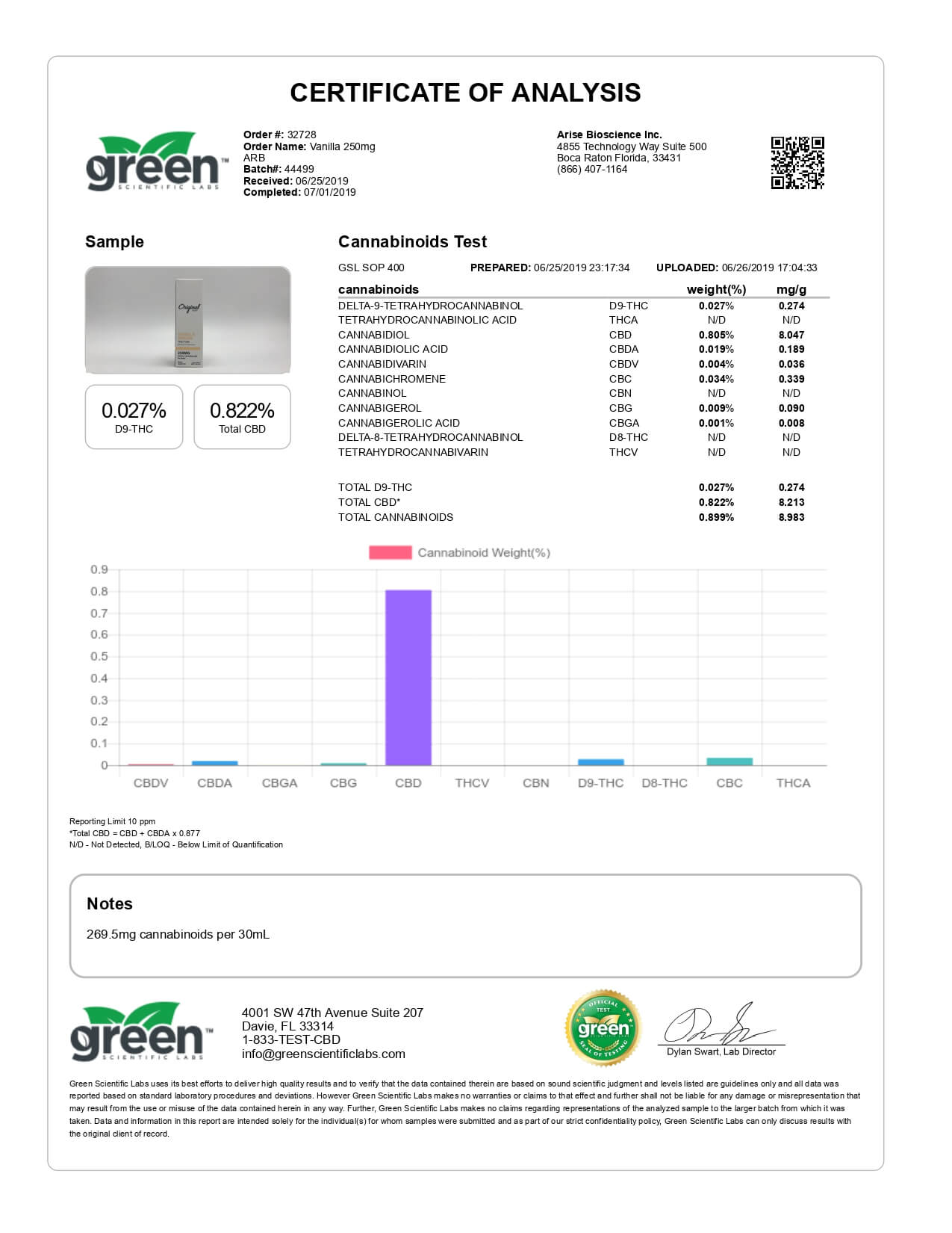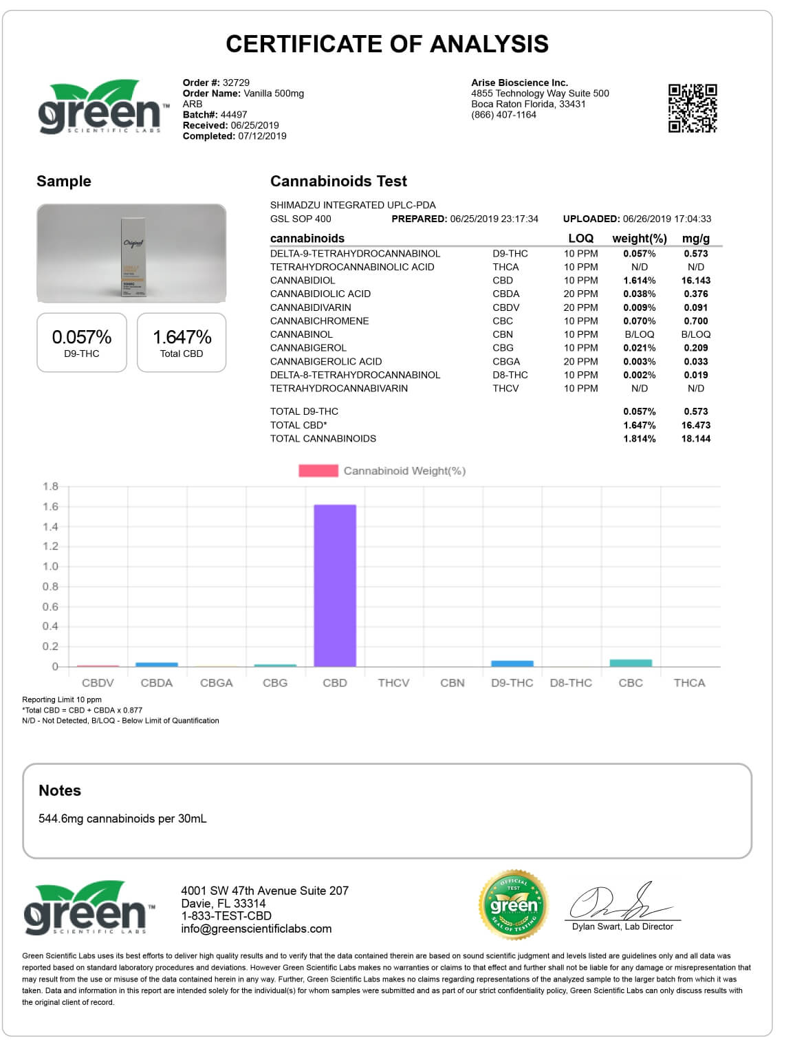 Original Hemp CBD Tincture Vanilla Dream Lab Report important details about vaping products.