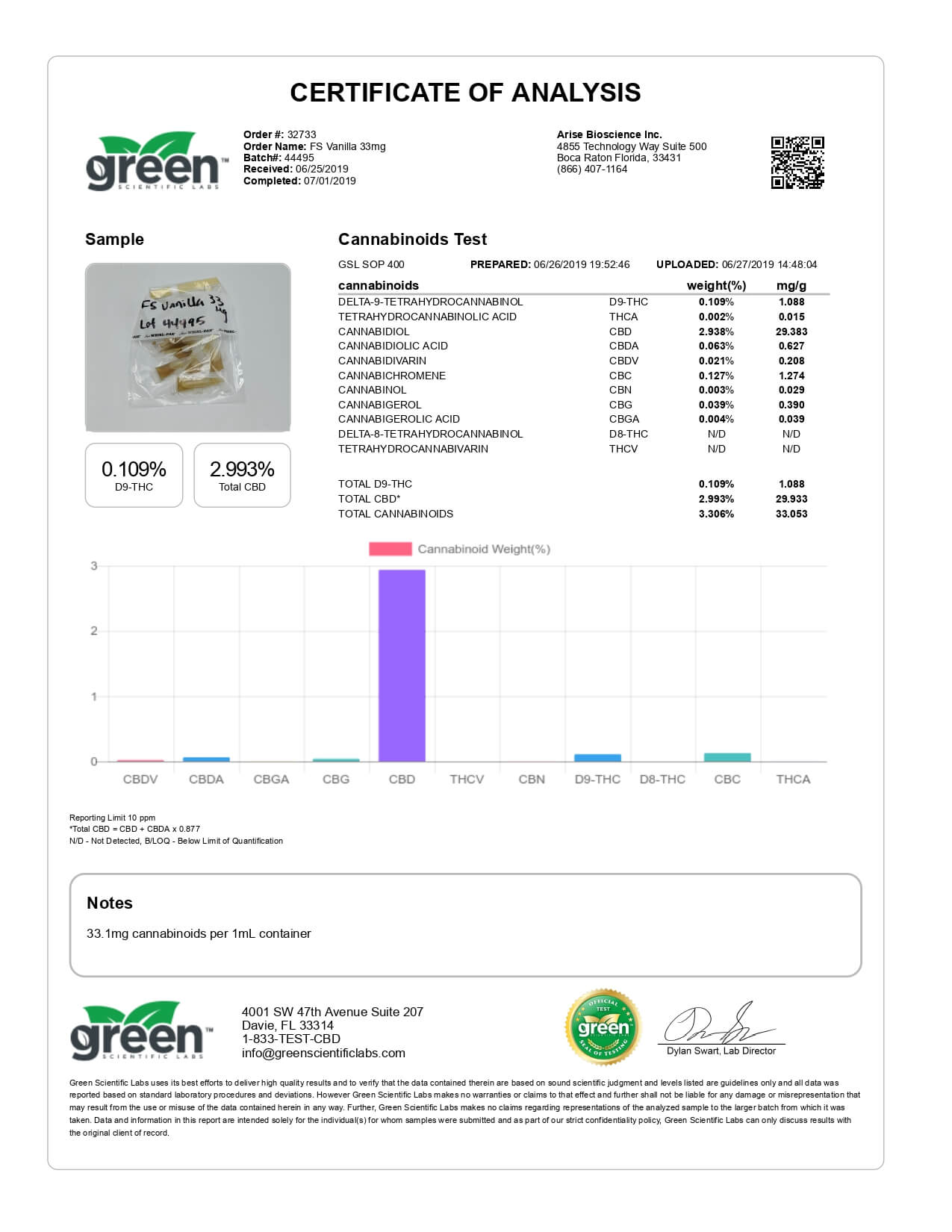Original Hemp CBD Tincture Vanilla Dream 33mg Lab Report