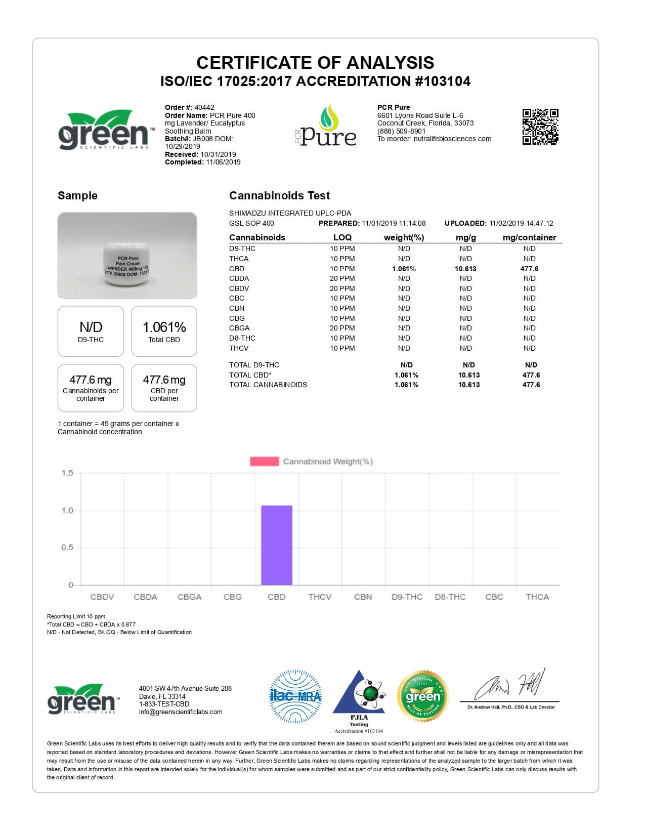 PCR Pure CBD Topical Lavender & Eycalyptus Full Spectrum Soothing Balm Lab Report
