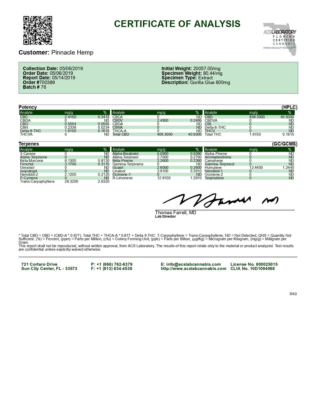 Pinnacle Hemp CBD Cartridge Gorilla Glue #4 Ki Pod Lab Report important details about vaping products.