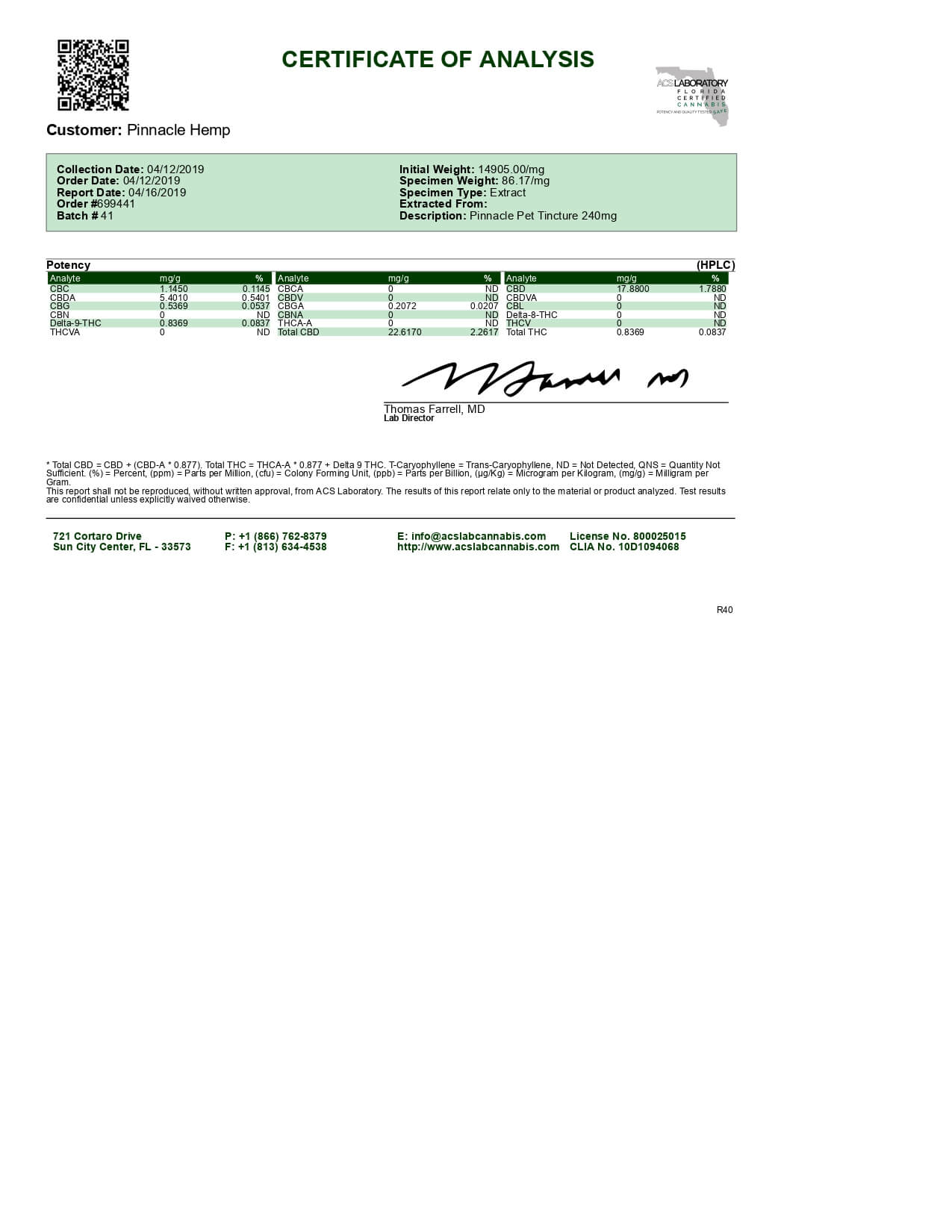 Pinnacle Hemp CBD Pet Tincture Salmon Tincture Lab Report