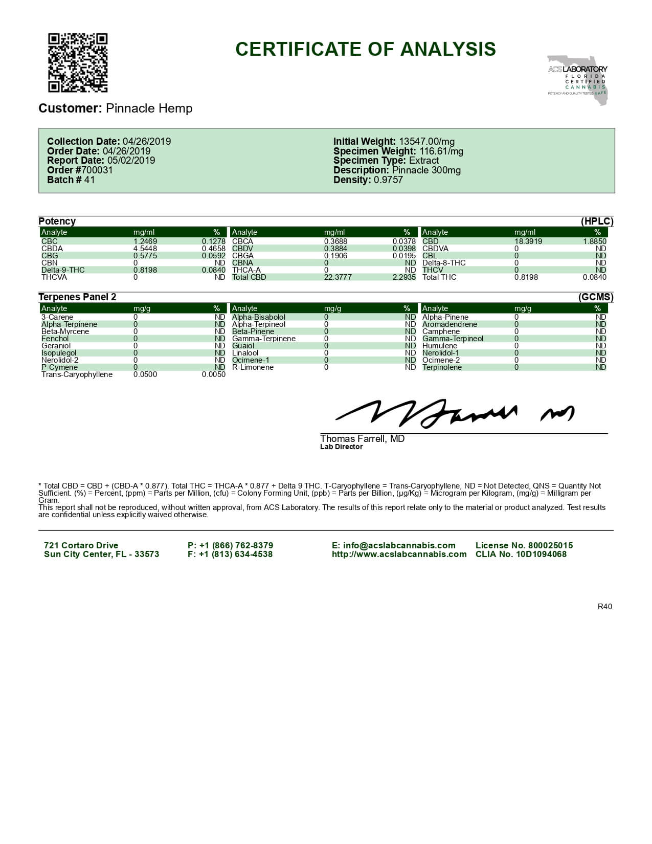 Pinnacle Hemp CBD Tincture Full Spectrum Lab Report