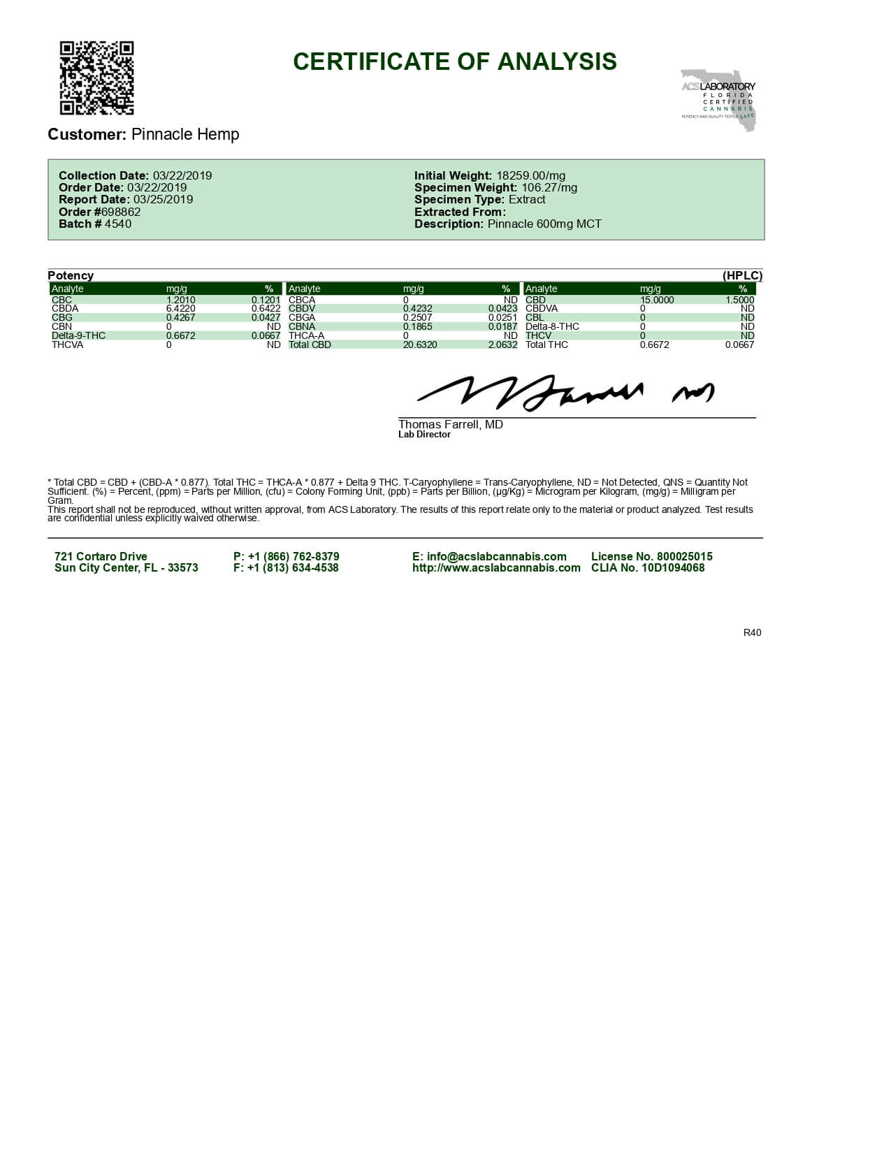 Pinnacle Hemp CBD Tincture Full Spectrum MCT Oil 600mg Lab Report