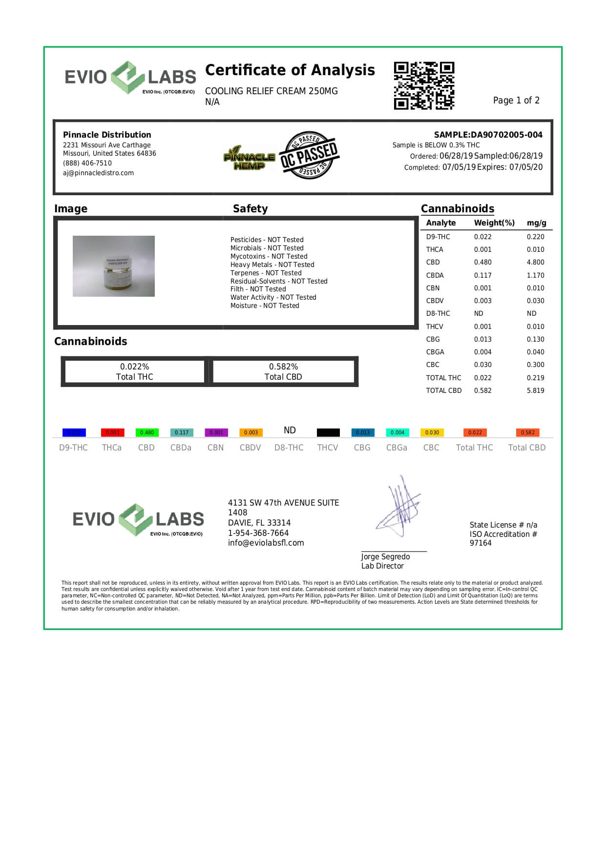 Pinnacle Hemp CBD Topical Relief Cream Cooling Lab Report