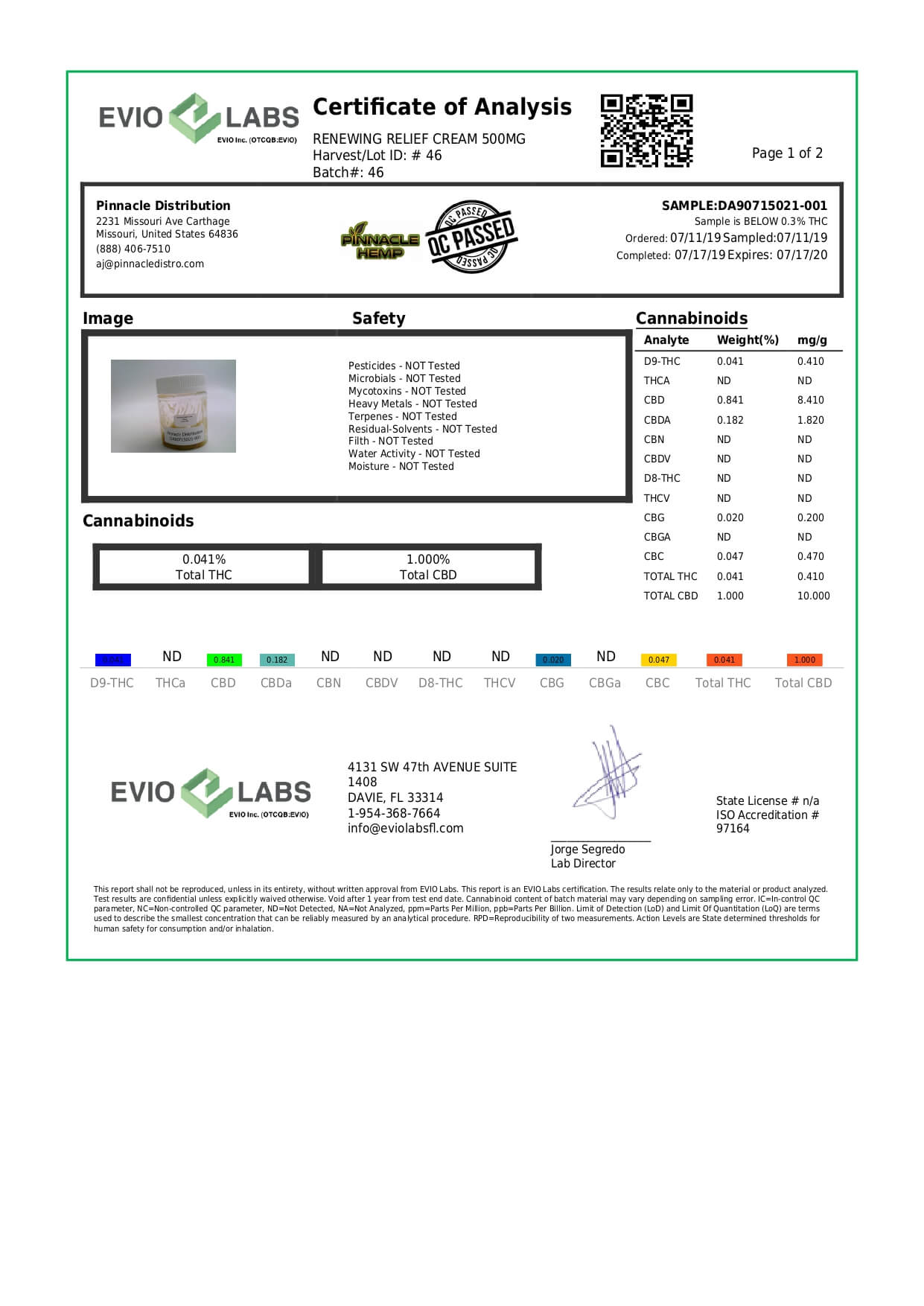 Pinnacle Hemp CBD Topical Relief Cream Renewing Lab Report