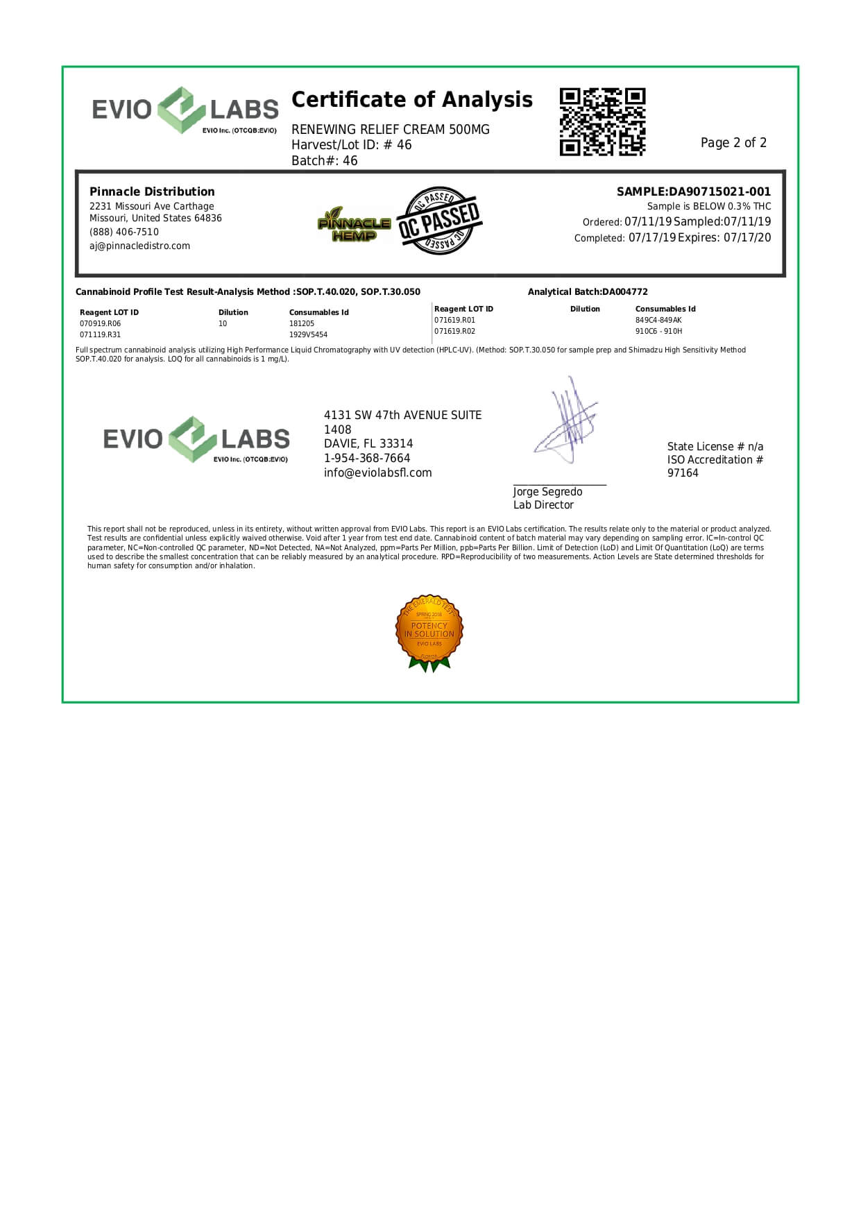 Pinnacle Hemp CBD Topical Relief Cream Renewing 500mg Lab Report