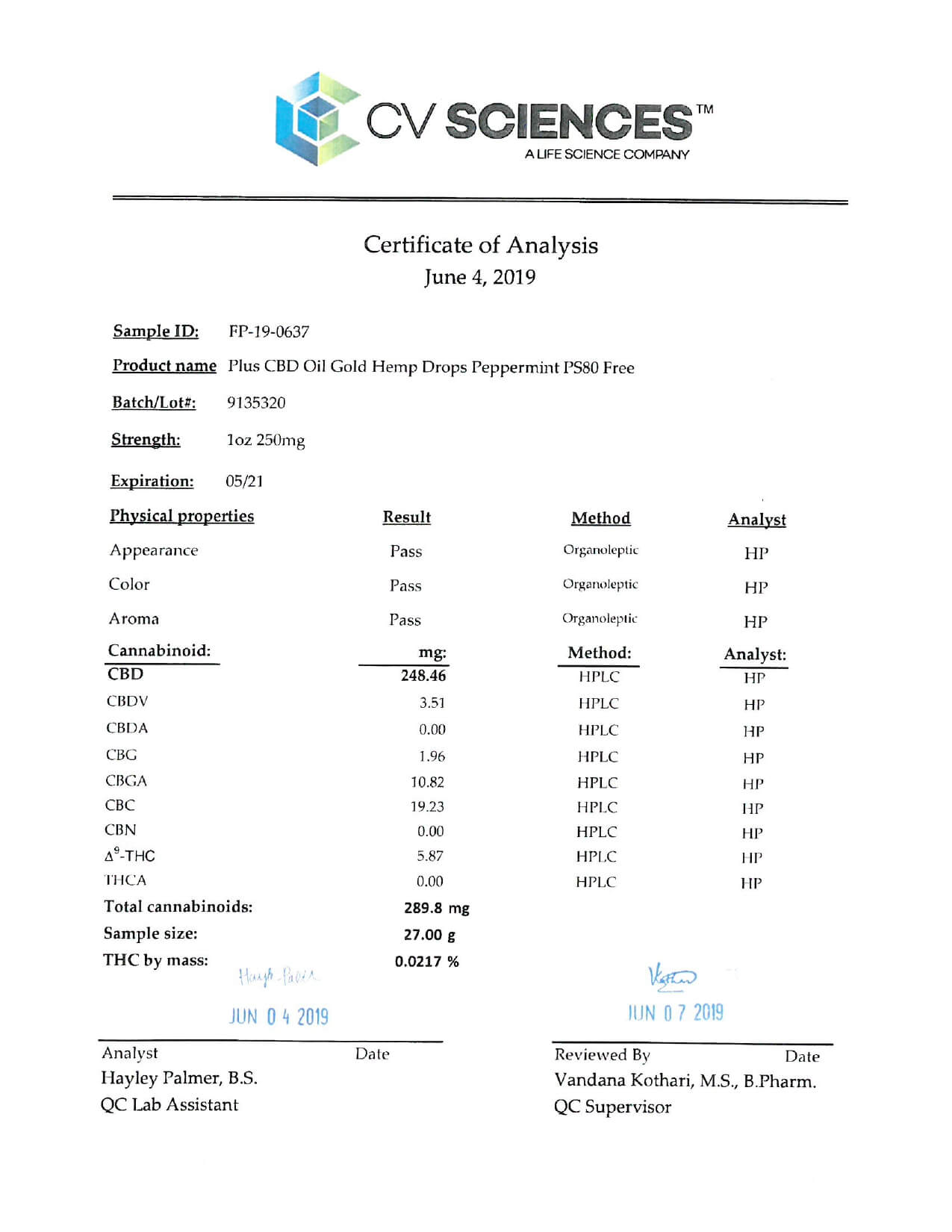 PlusCBD Oil CBD Tincture Gold Drops Peppermint 250mg Lab Report