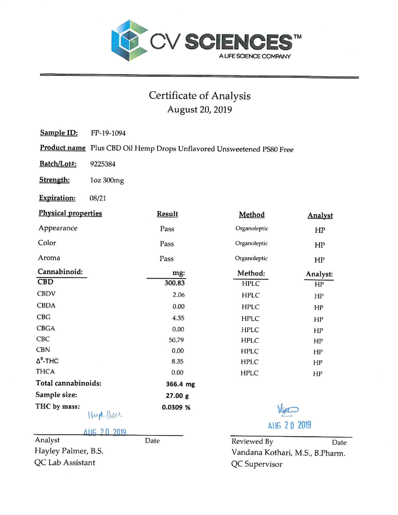 PlusCBD Oil CBD Tincture Green Drops Unsweetened Lab Report important details about vaping products.