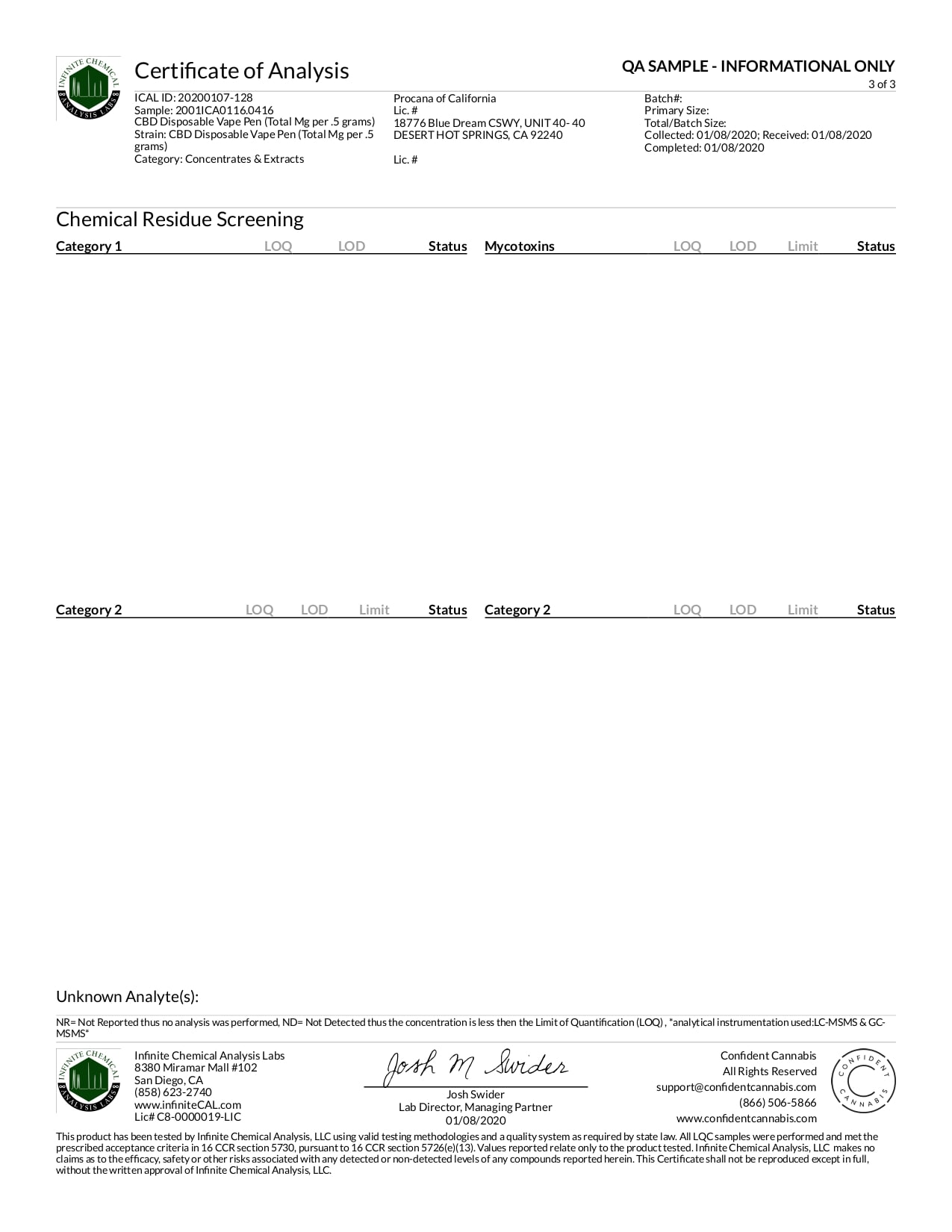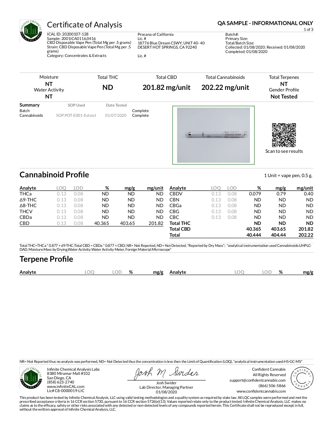 Procana CBD Disposable Vaporizer Lab Report Tangie 200mg