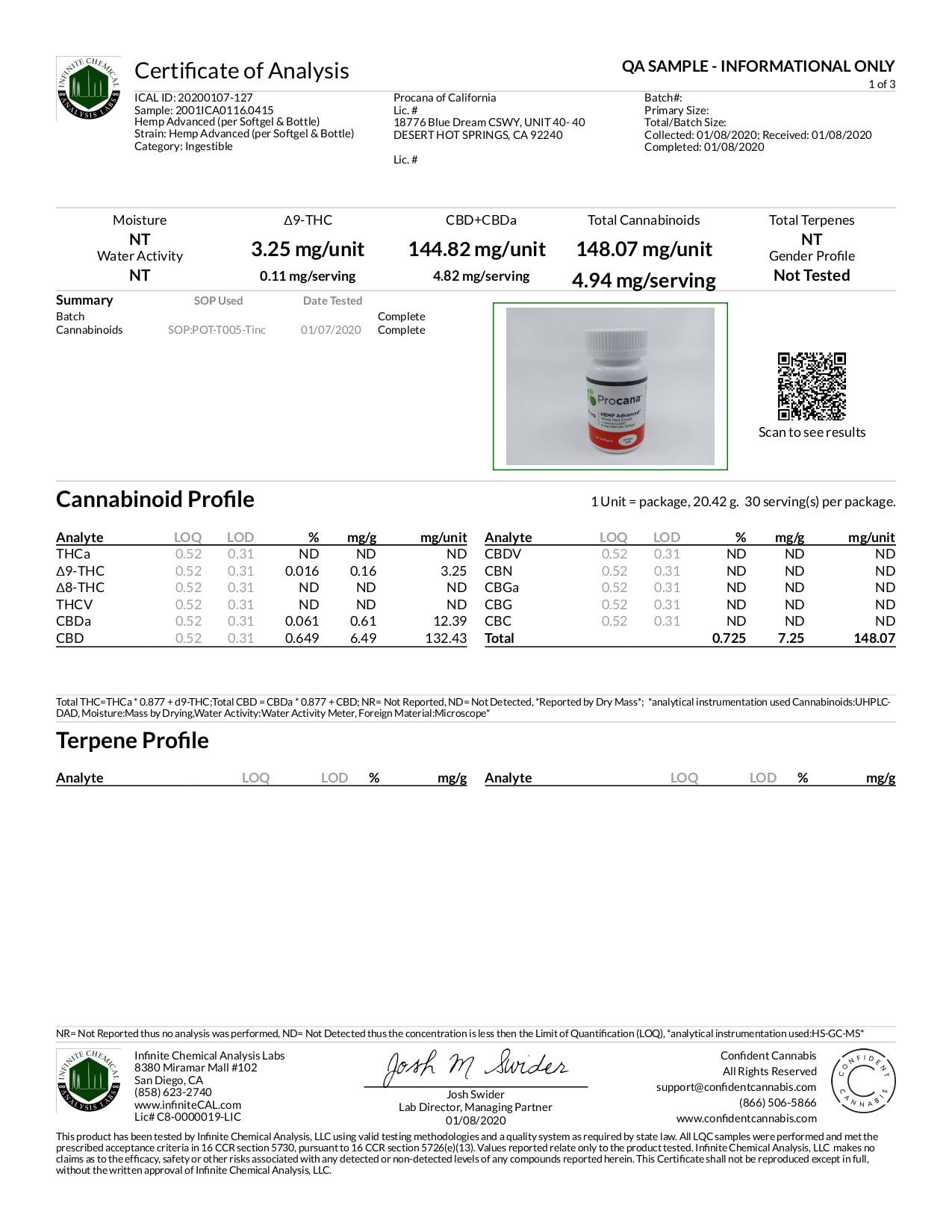 Procana CBD Hemp Advanced Softgels 150mg Lab Report