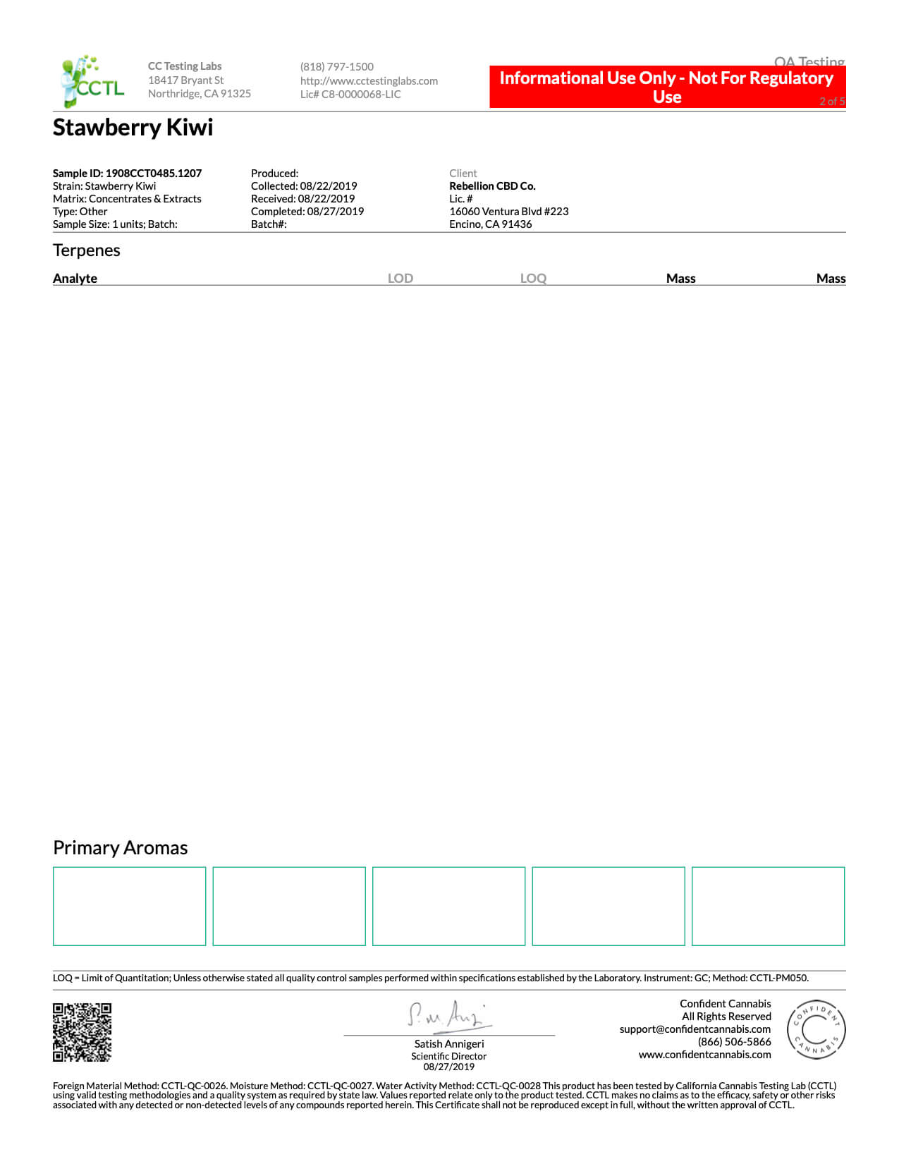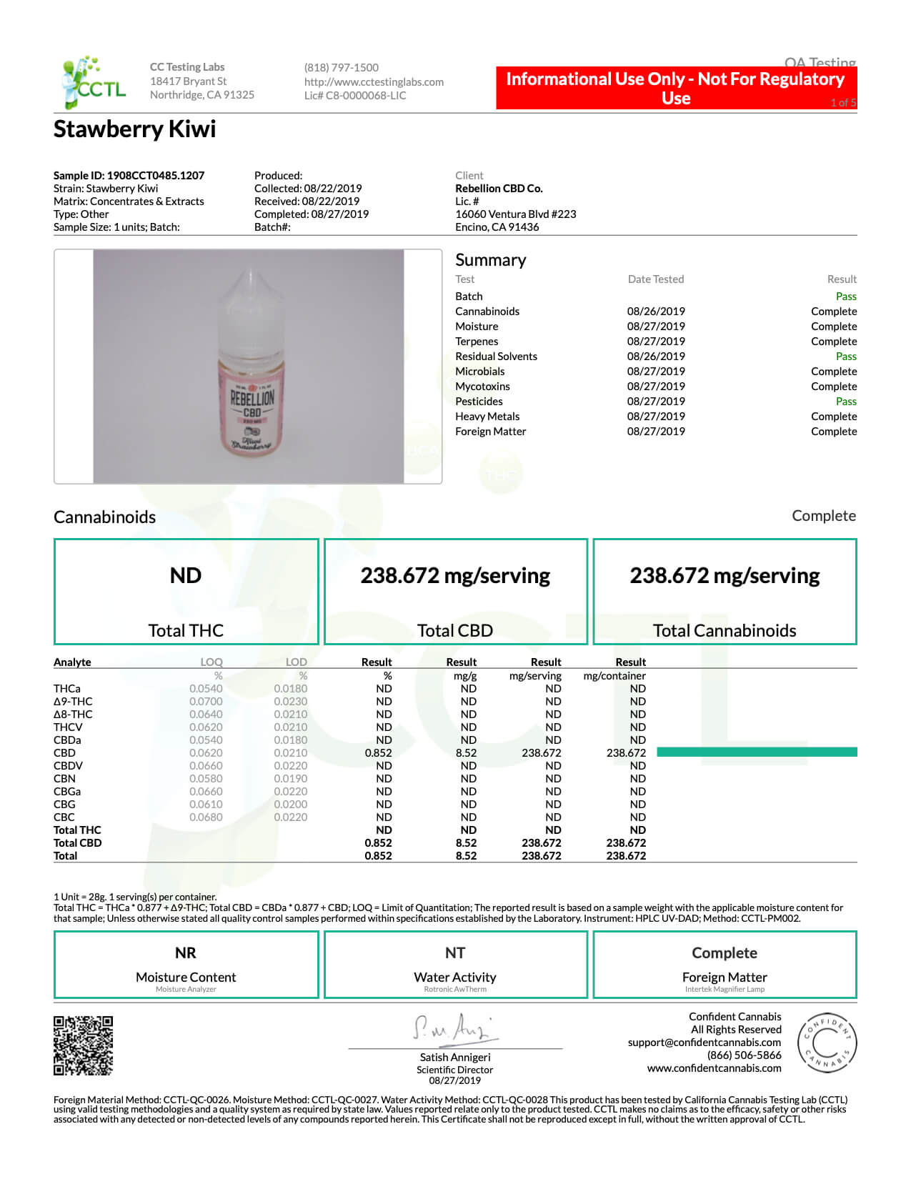 REBELLION CBD Kiwi Strawberry E-Juice Lab Reports certificate provided in connection to vapes products.