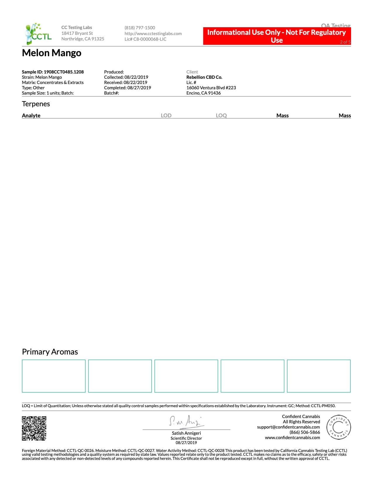 REBELLION CBD Mango E-Juice Lab Reports educational documentation provided relating to vapes products.
