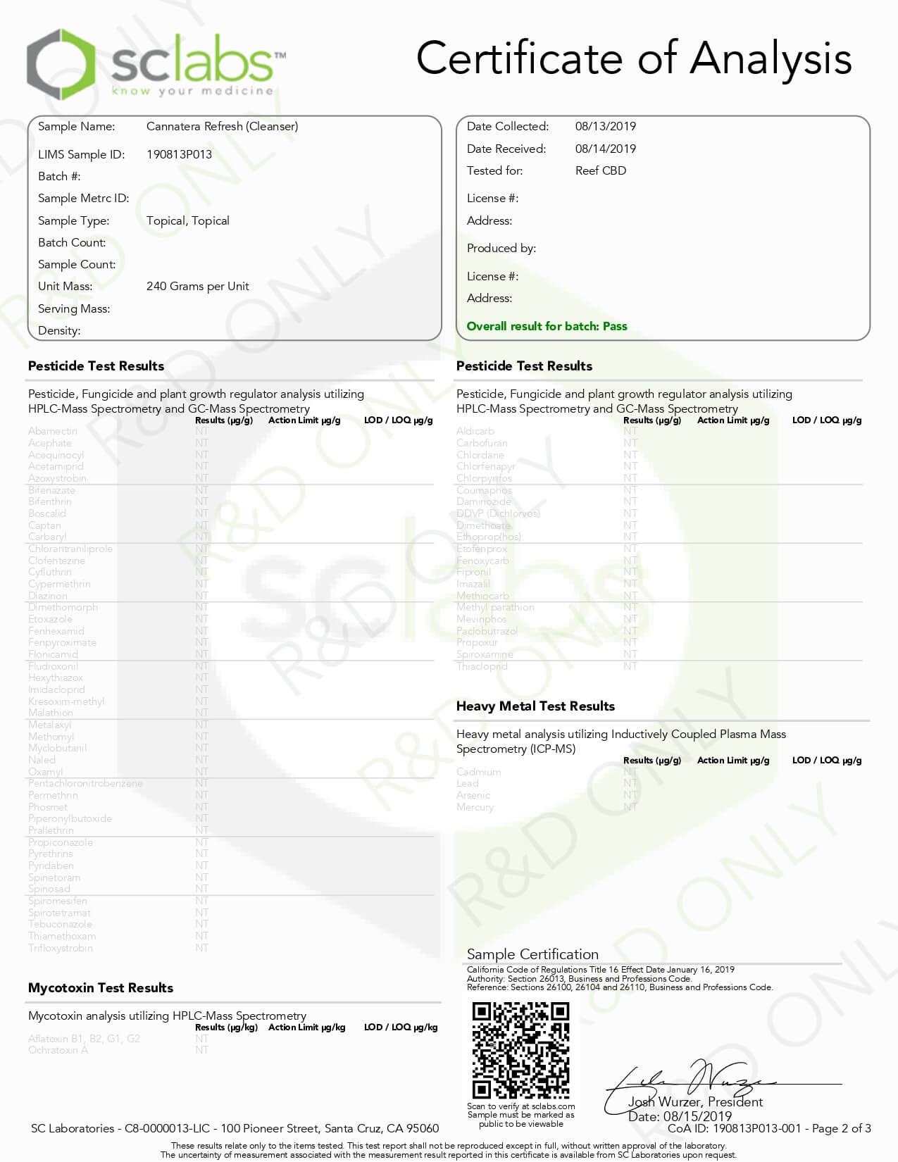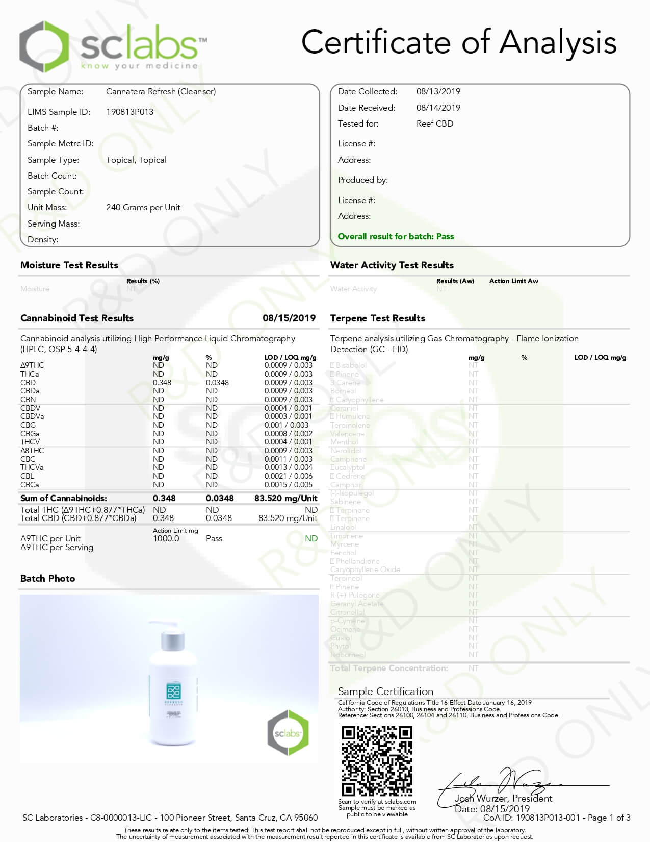 Reef CBD Topical Cannatera Refresh Cleanser Lab Report