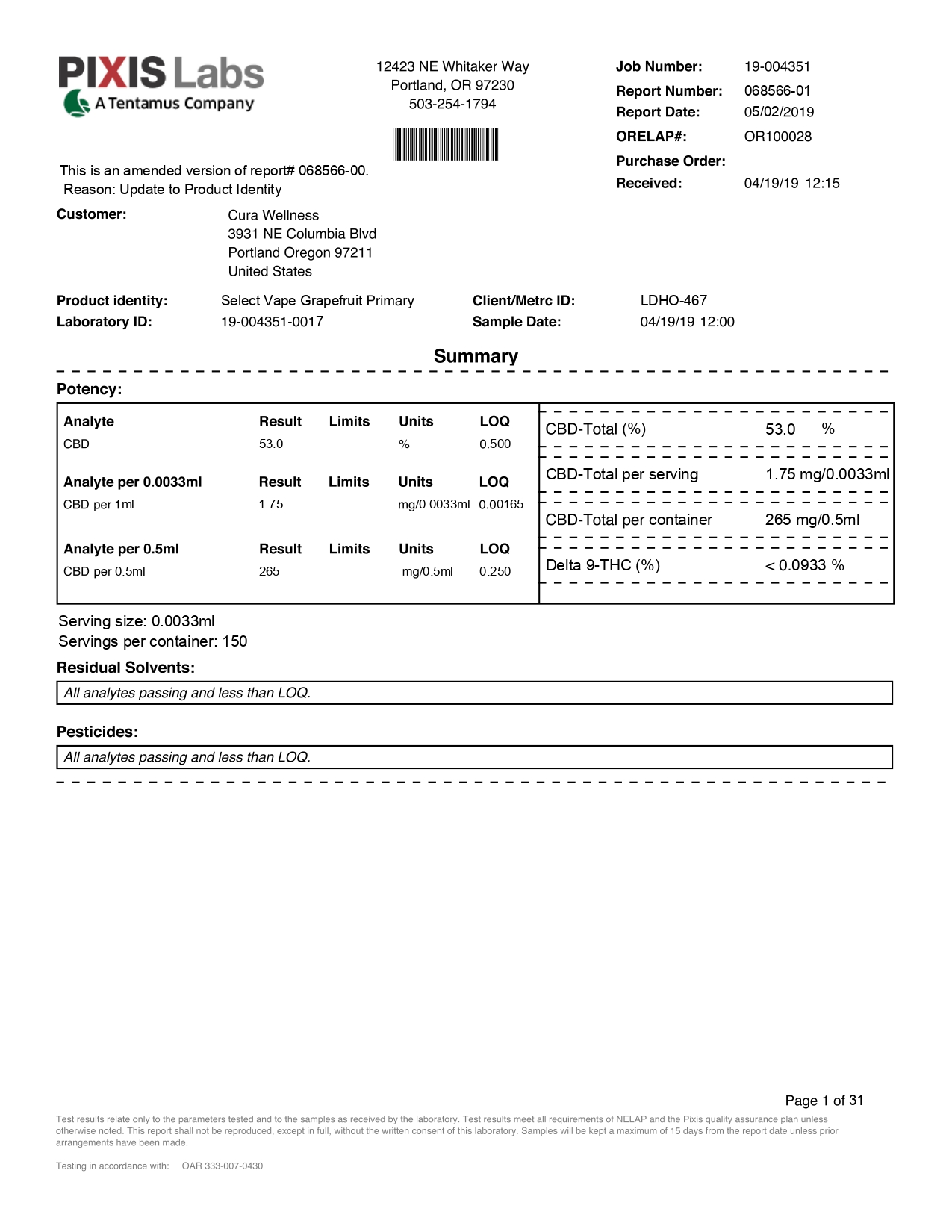 Revive Grapefruit CBD Vape Pen Social CBD Lab Report