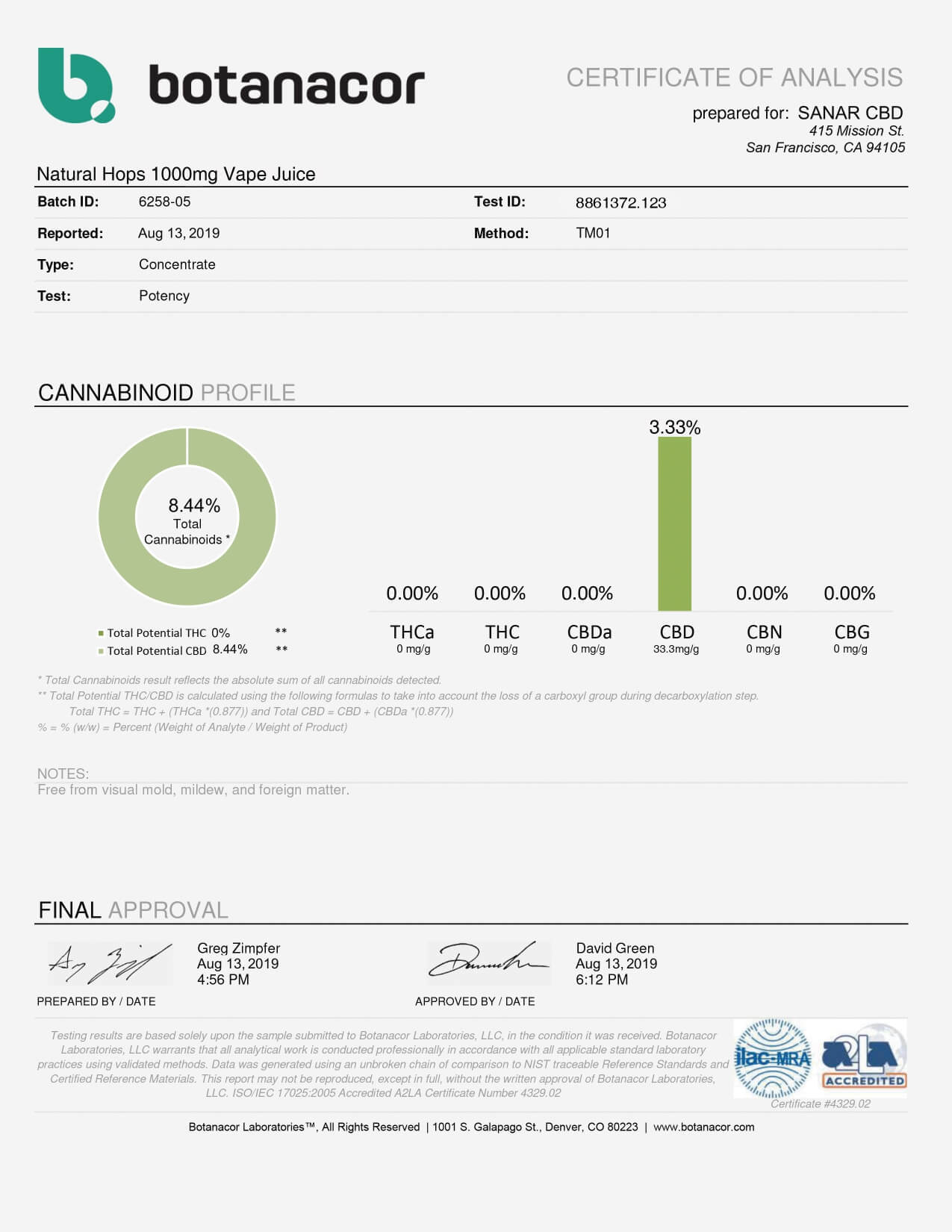 Sanar CBD Vape Juice Natural Hops Terpenes 1000mg Lab Report