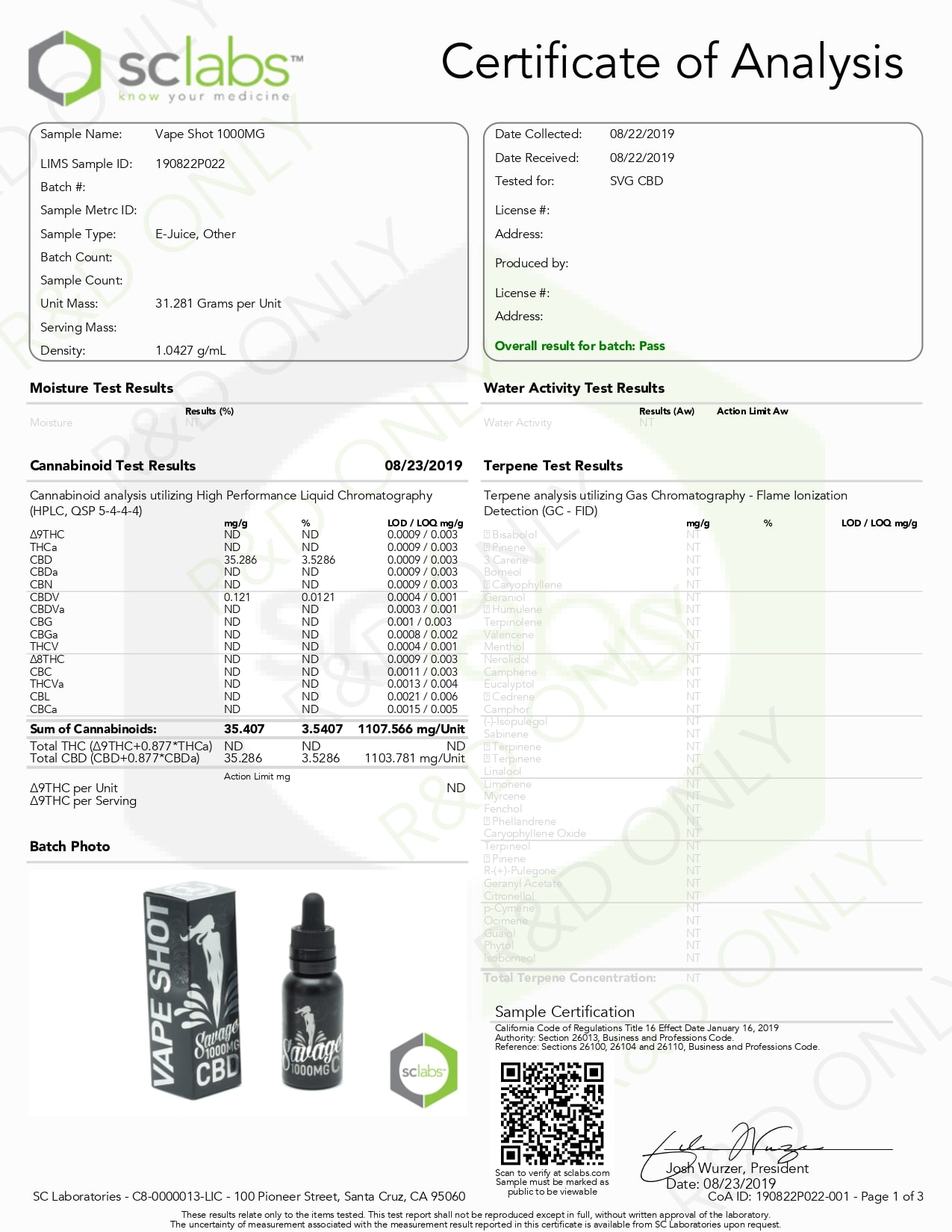 SAVAGE Vape Shot CBD Vape Juice 1000mg Lab Report