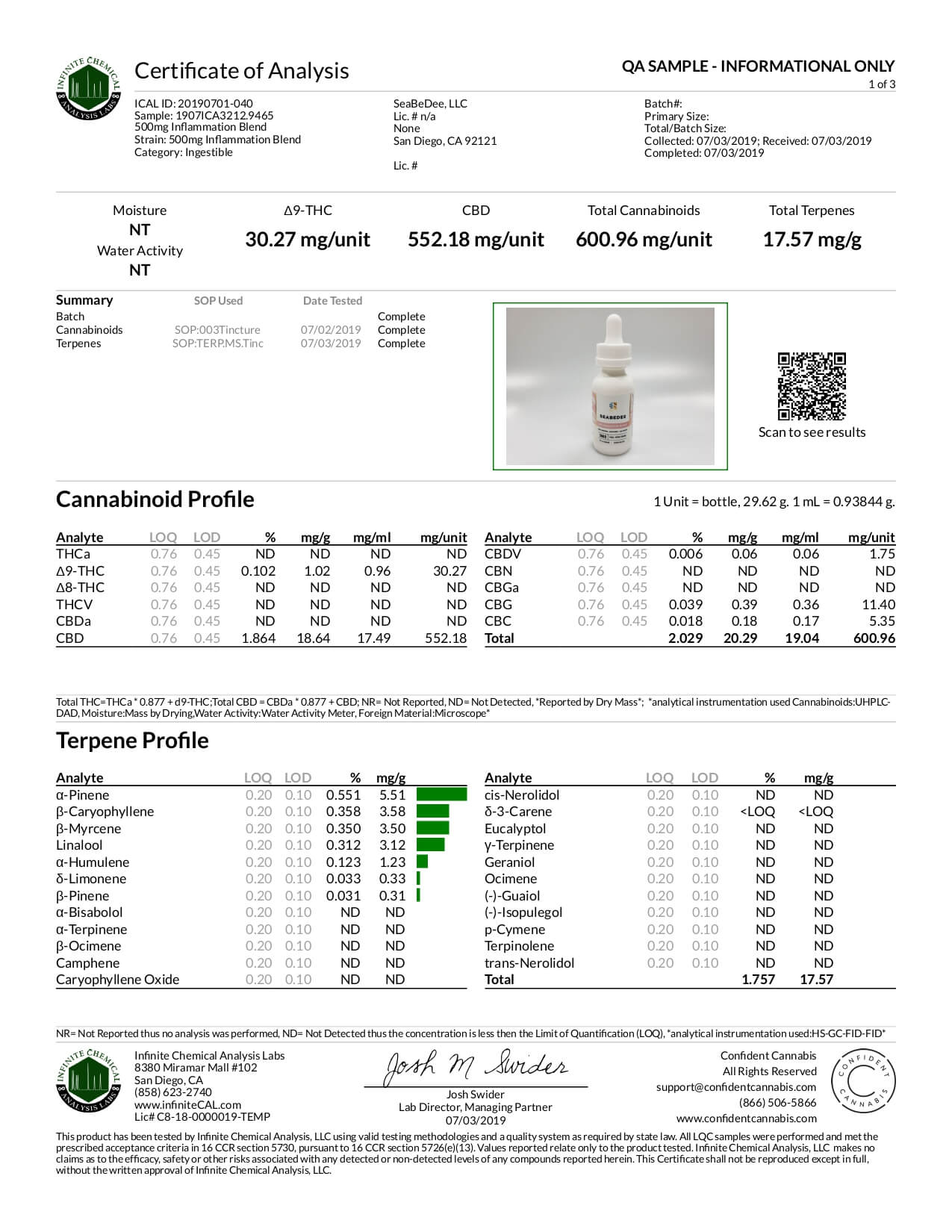 Seabedee CBD Tincture Inflammation Blend 500mg Lab Report