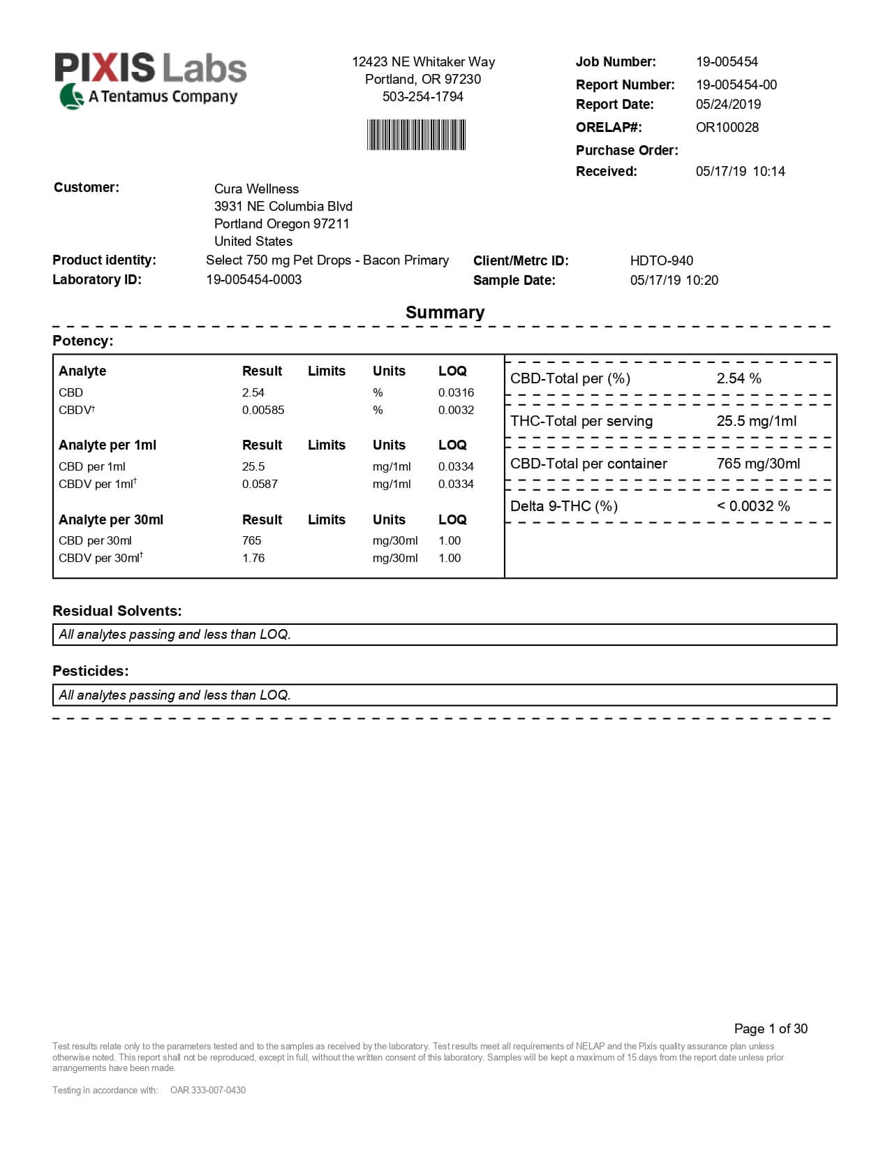 Select CBD Pet Tincture Bacon Lab Report
