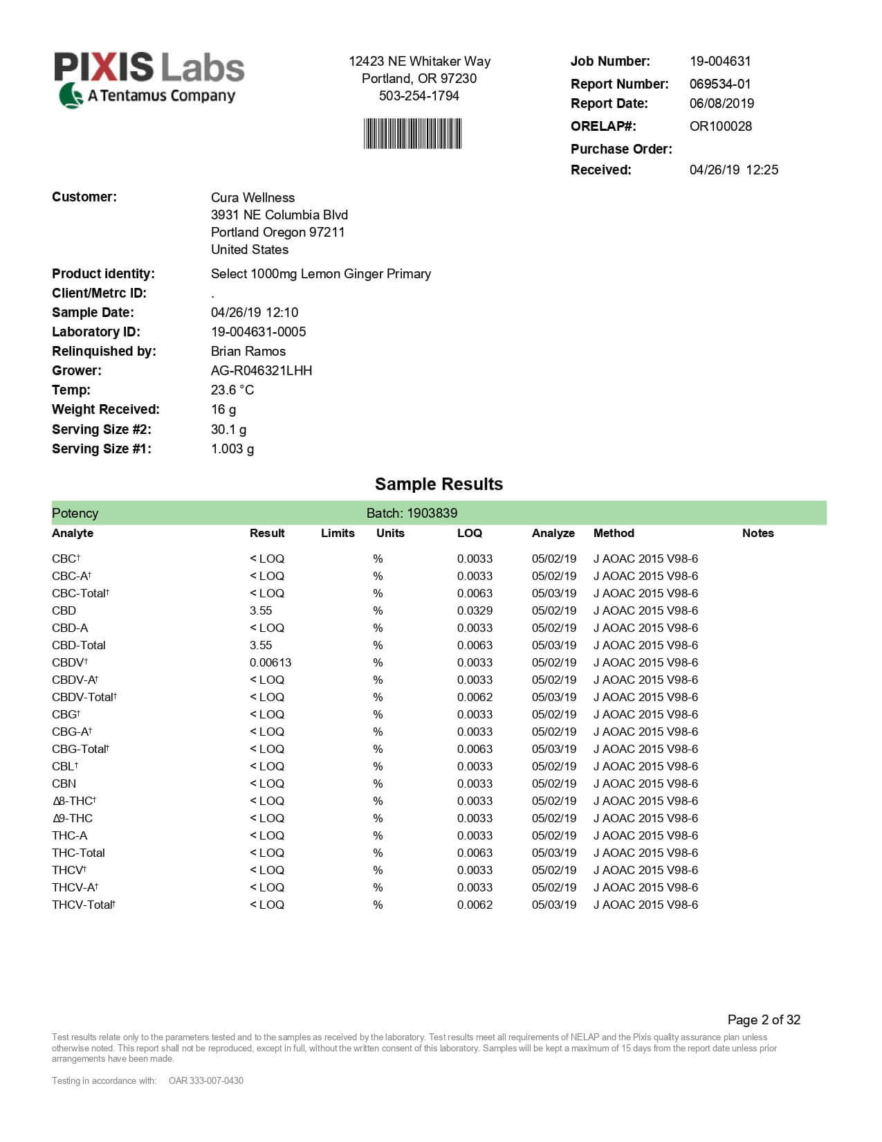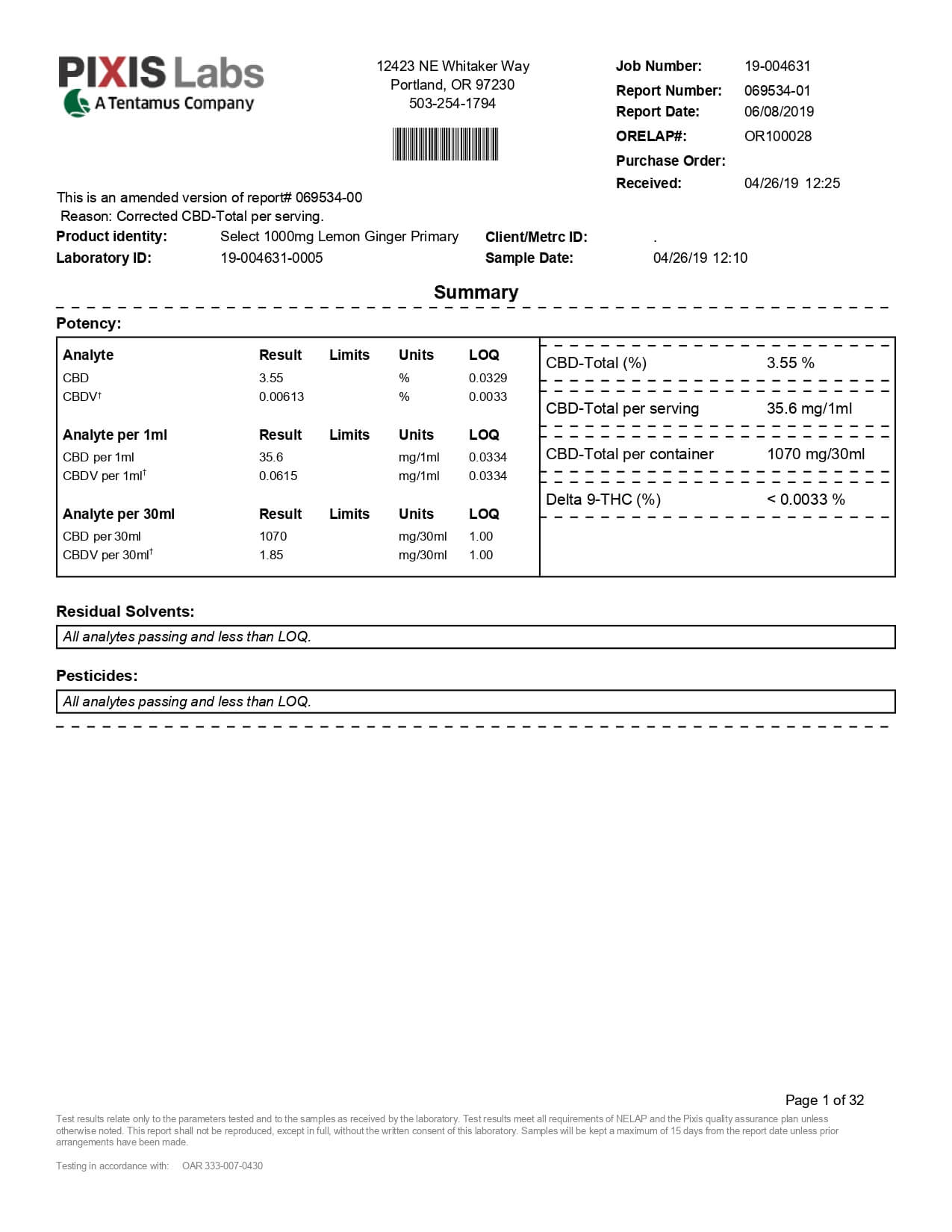 Select CBD Tincture Lemon Ginger Lab Report