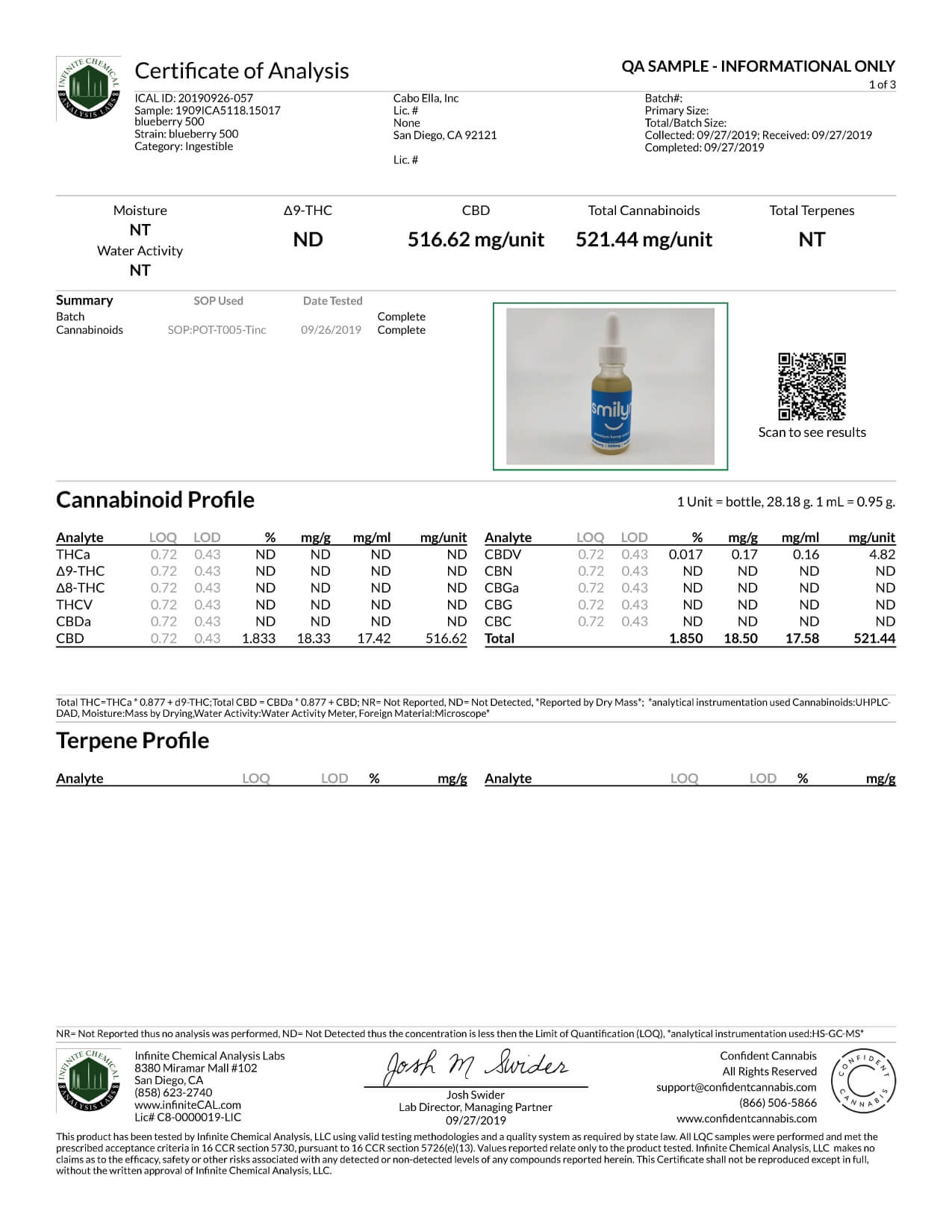 Smilyn CBD Tincture Blueberry 500mg Lab Report