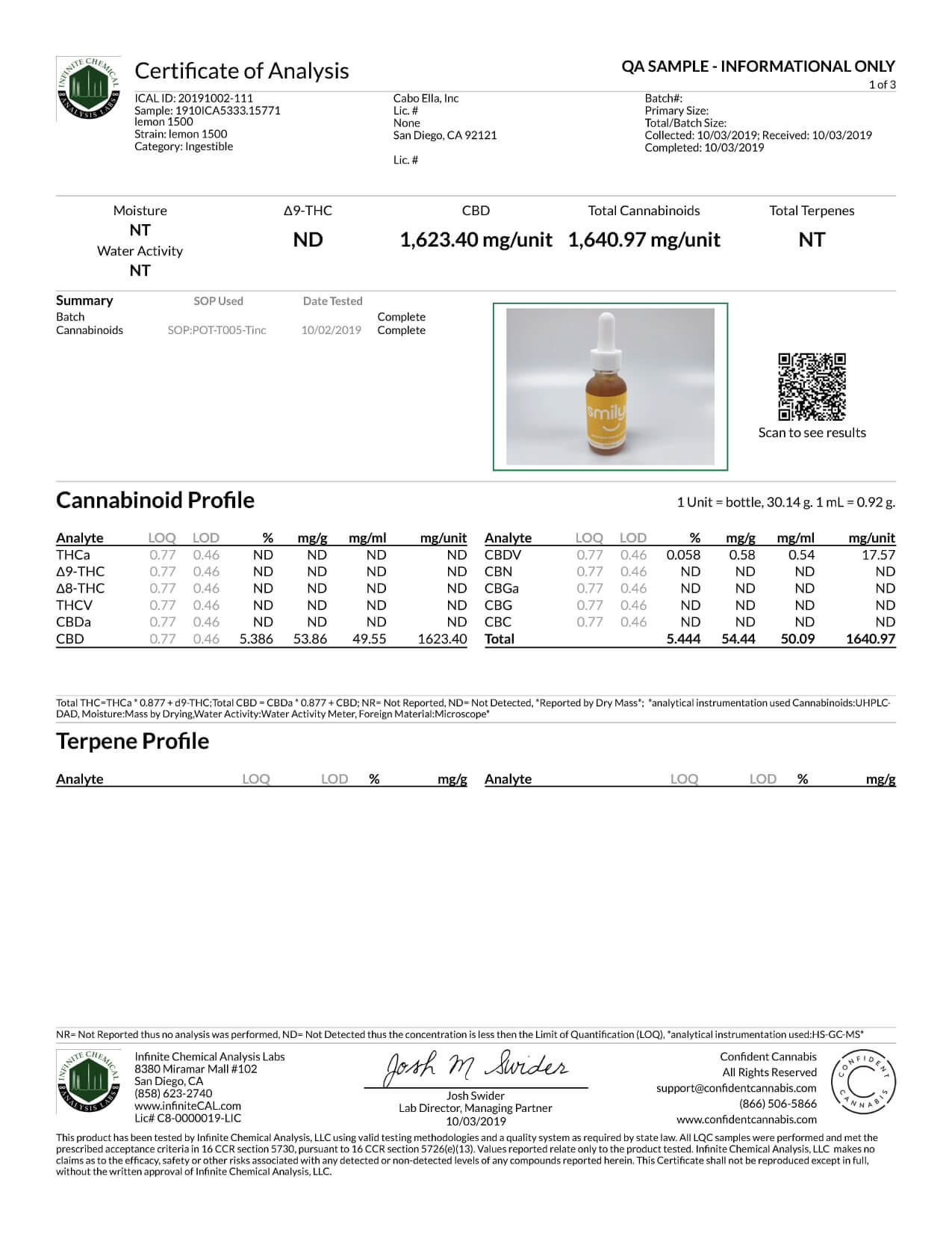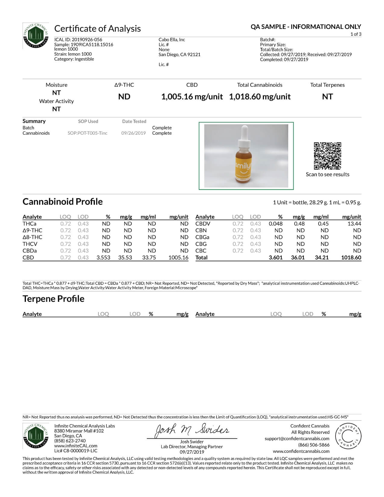 Smilyn CBD Tincture Lemon 1000mg Lab Report