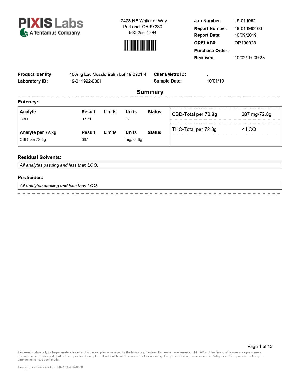 Social CBD Calming Lavender Muscle Balm Stick 400mg Lab Report