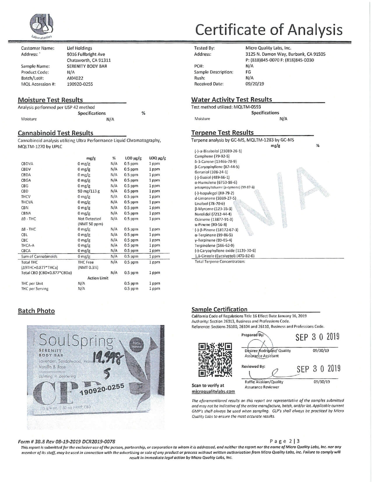 SoulSpring CBD Bath Serenity Body Bar Lab Report