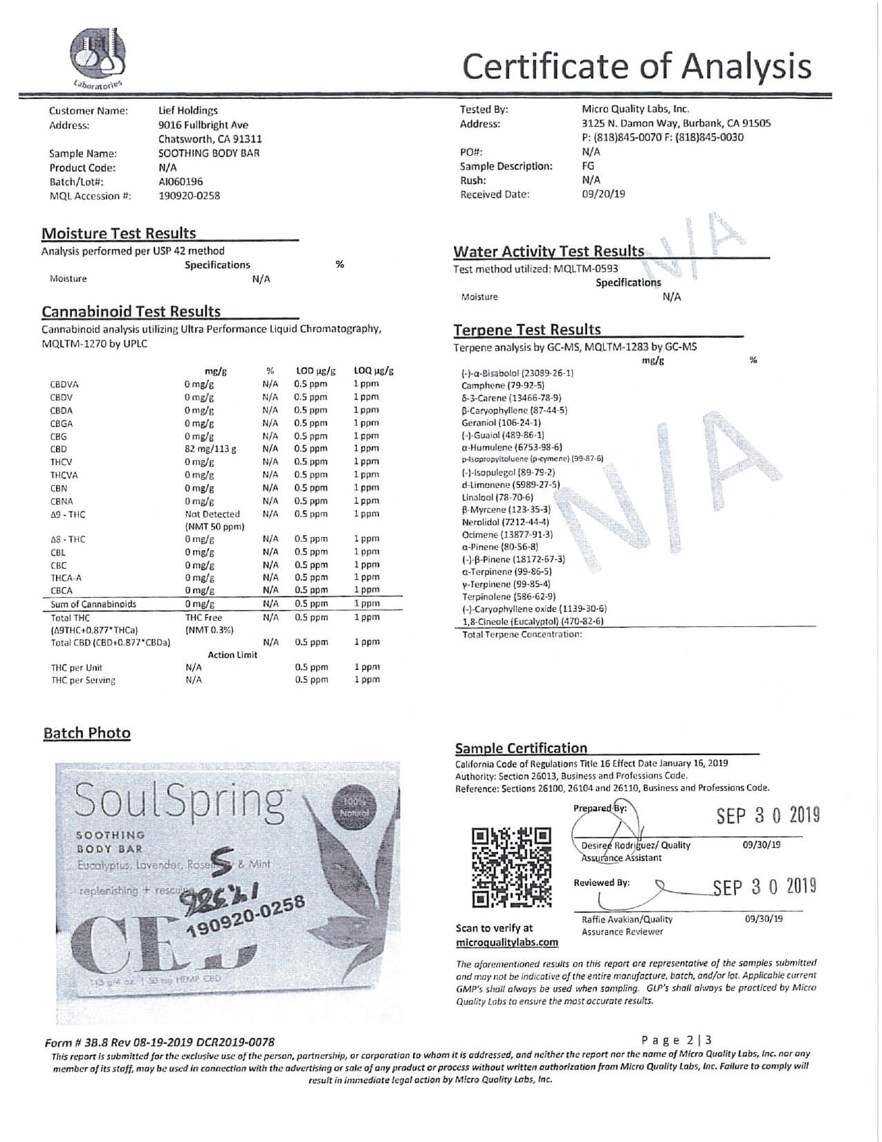 SoulSpring CBD Bath Soothing Body Bar Lab Report