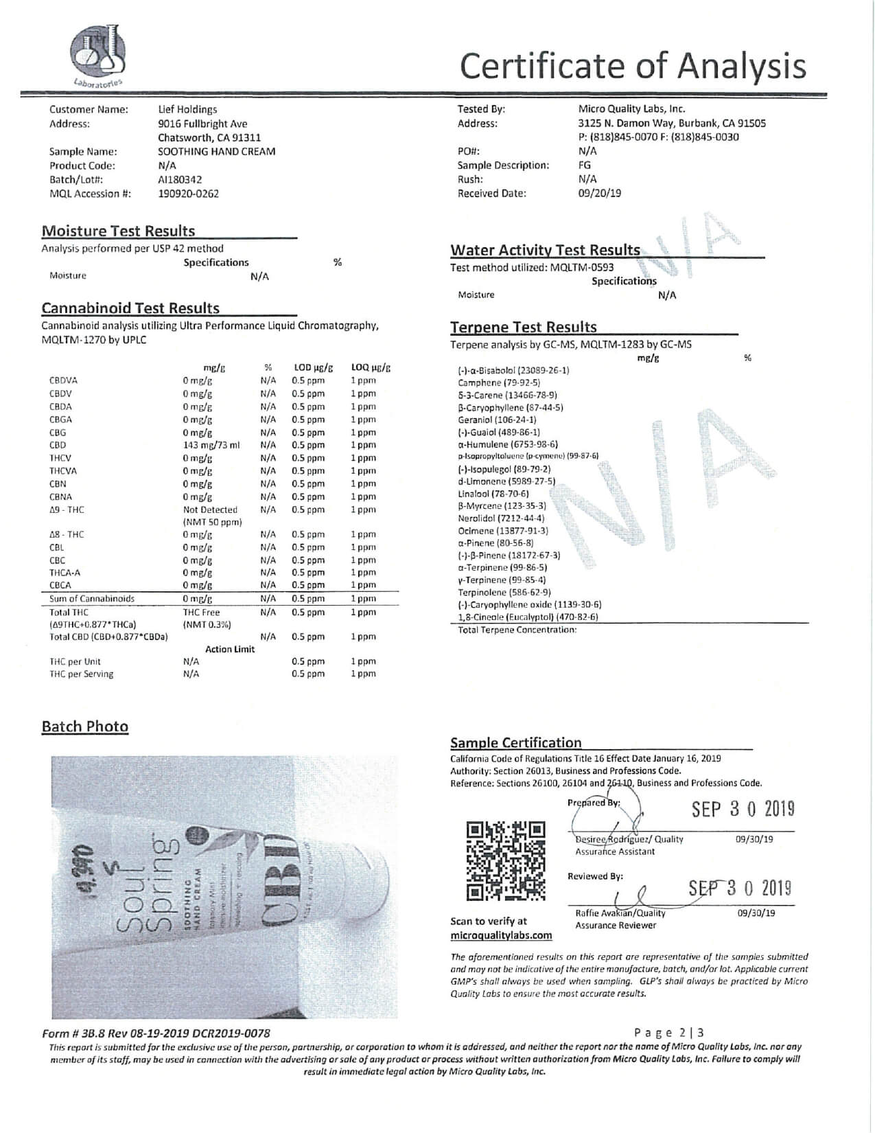 SoulSpring CBD Topical Soothing Hand Cream Lab Report