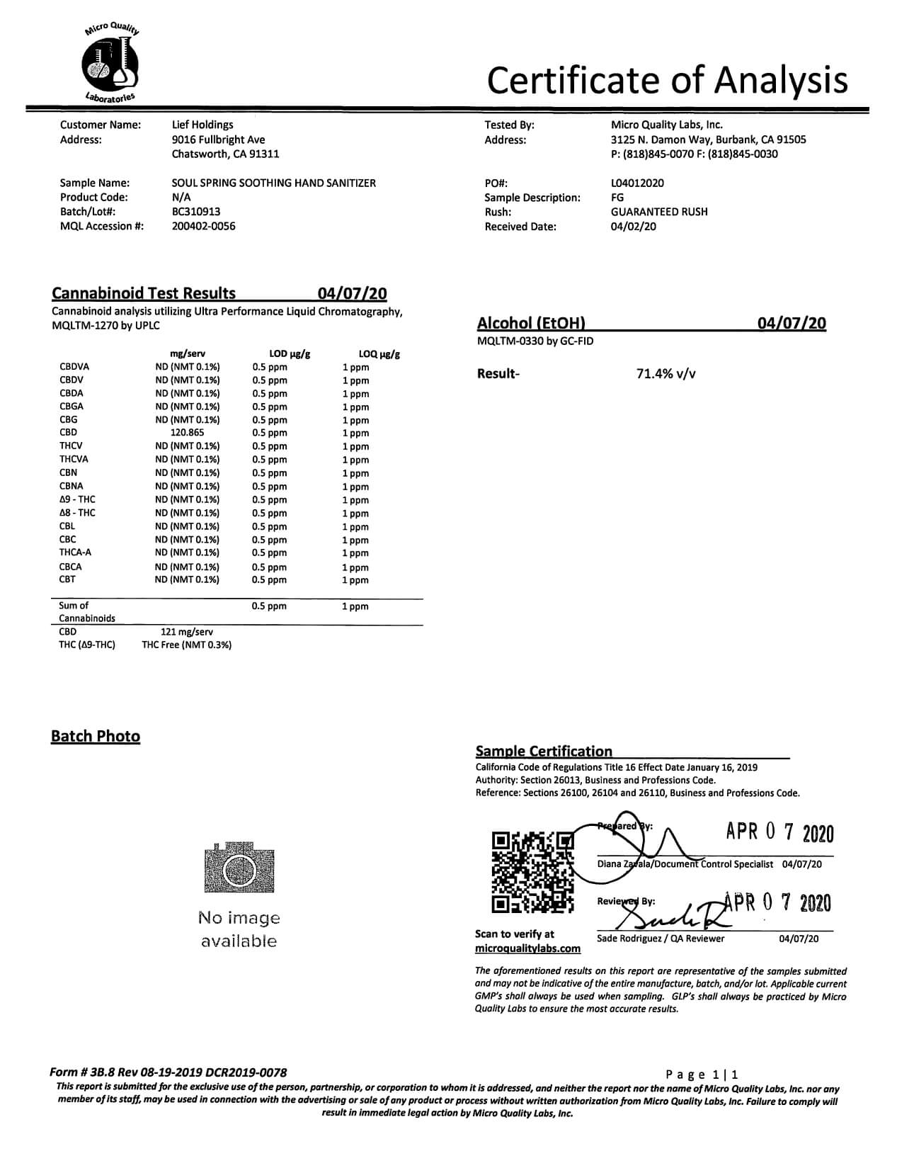 SoulSpring CBD Topical Soothing Hand Sanitizer Lab Report
