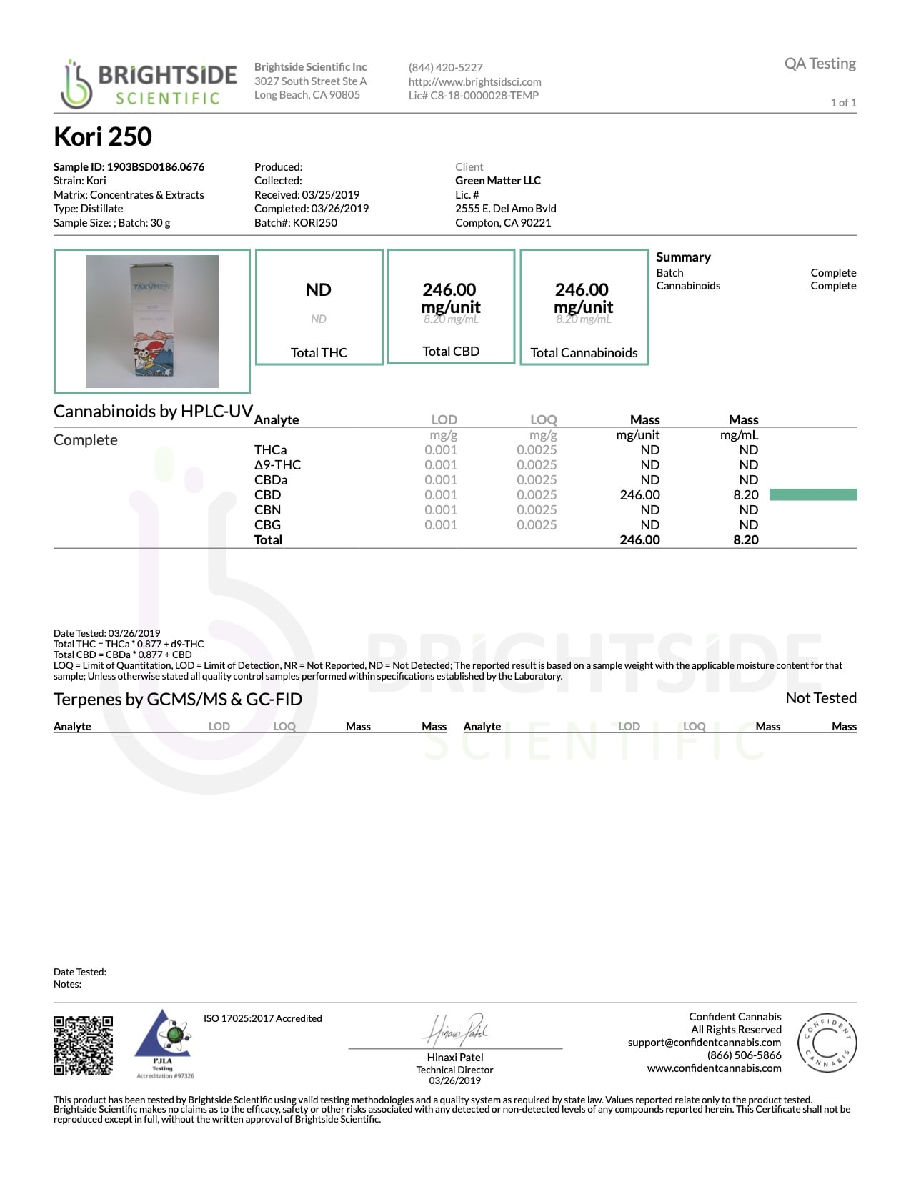 Takumi by Yami Vapor CBD Vape Tincture Kori 250mg Lab Report