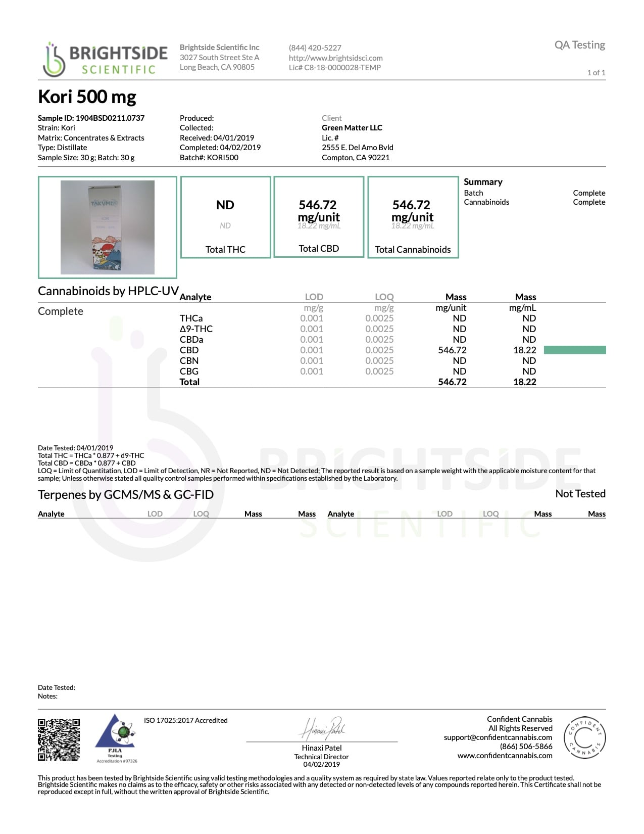 Takumi by Yami Vapor CBD Vape Tincture Kori Lab Report important details about vaping products.