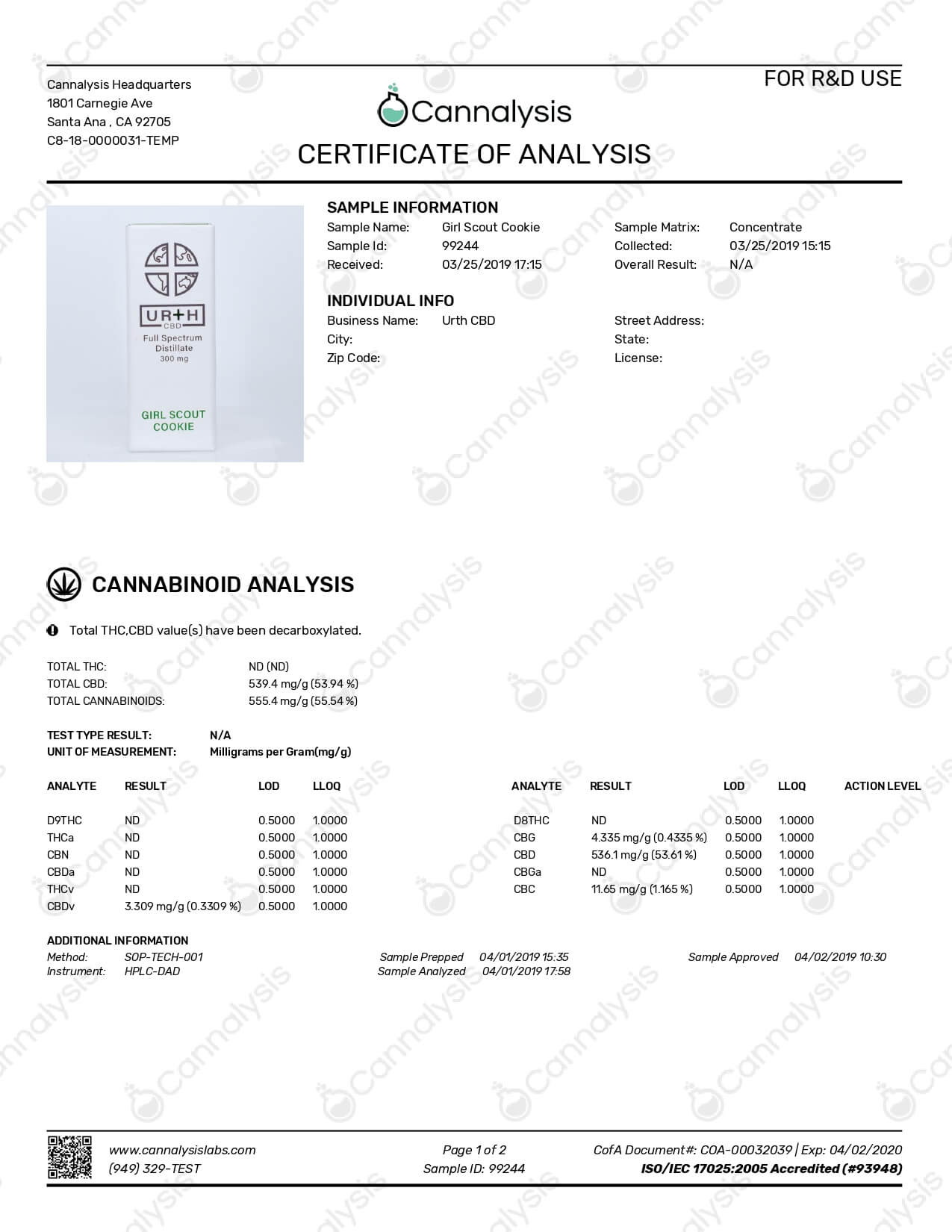 Urth CBD Cartridge Girl Scout Cookie Pain Lab Report