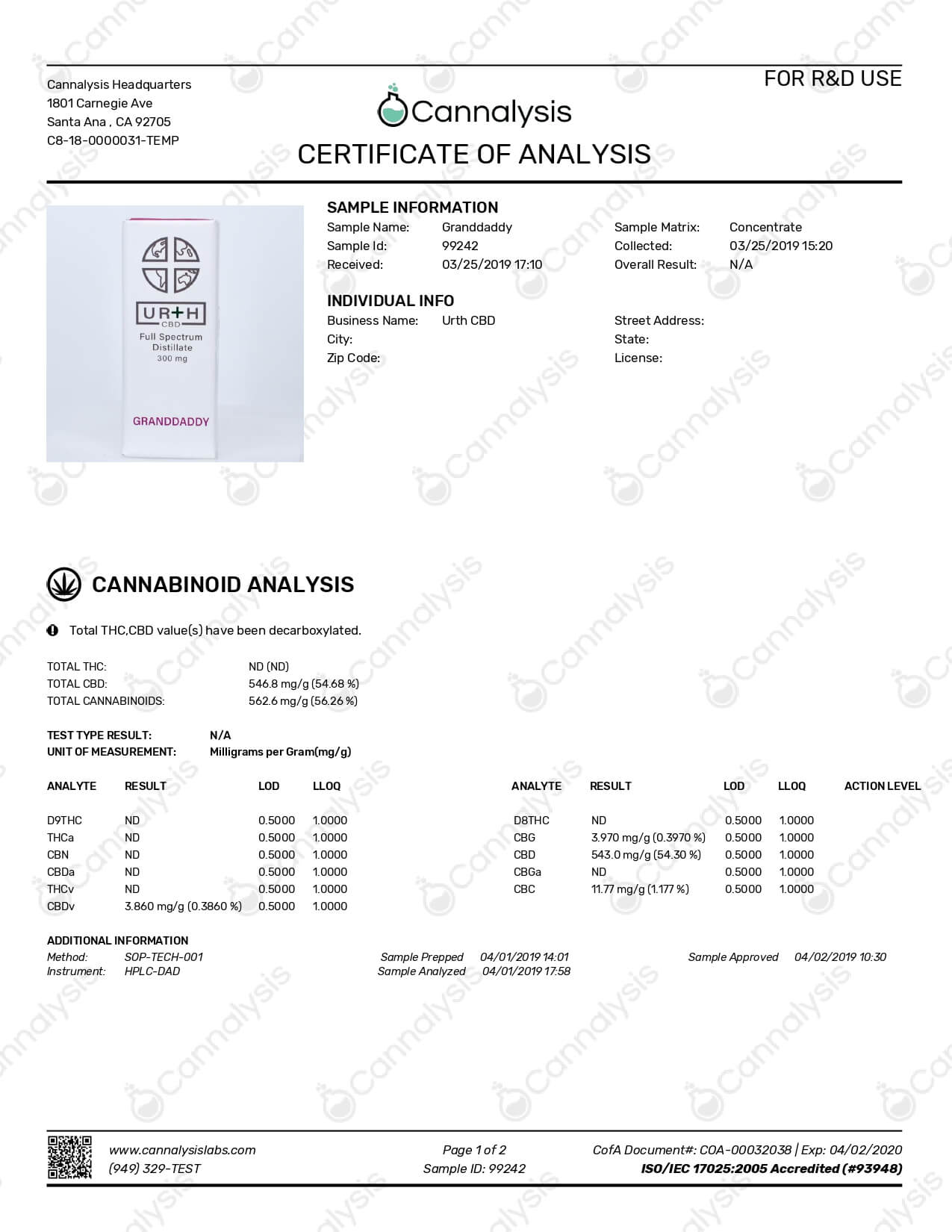 Urth CBD Cartridge Grandaddy Sleepy Lab Report