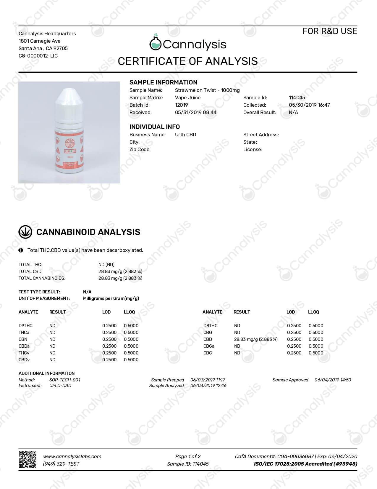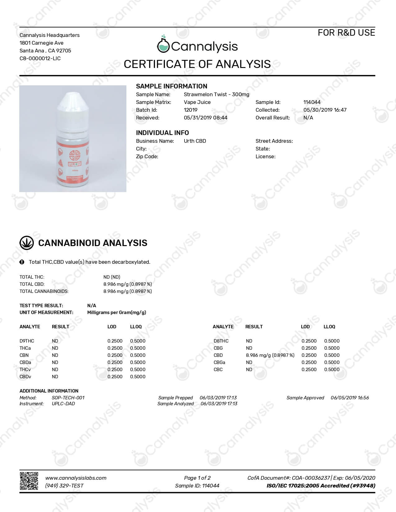 Urth CBD Vape Juice Strawmelon Twist Lab Report important details about vaping products.