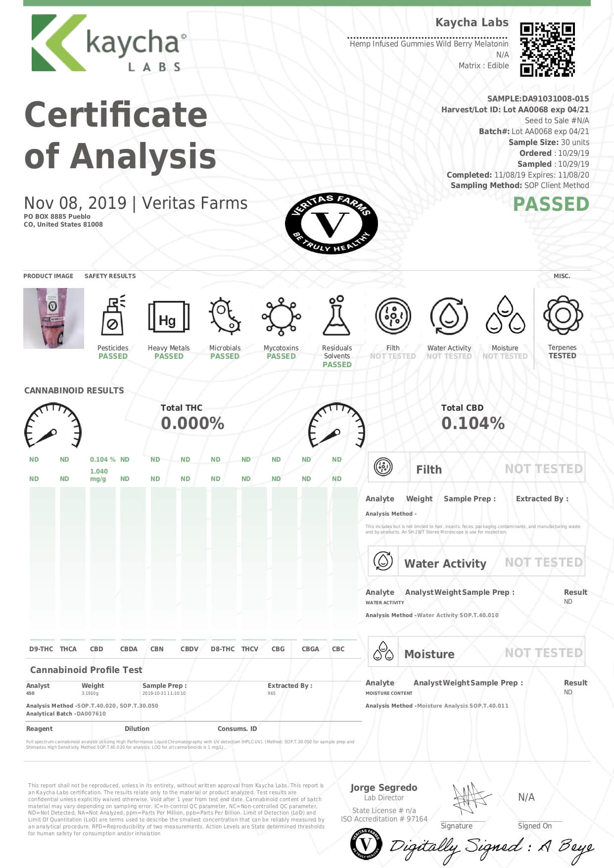 Veritas Farms CBD Edible Wild Berry Gummies w/Melatonin Lab Report important details about vaping products.
