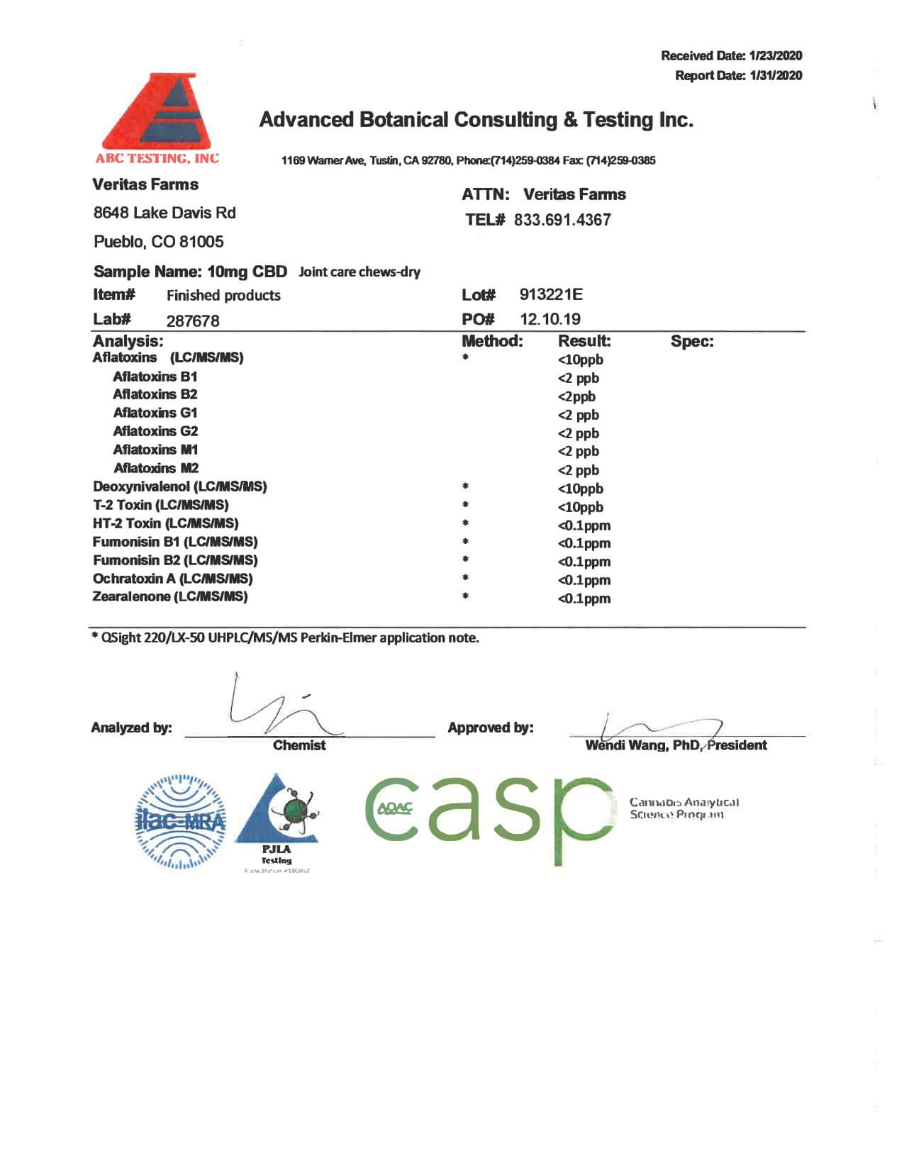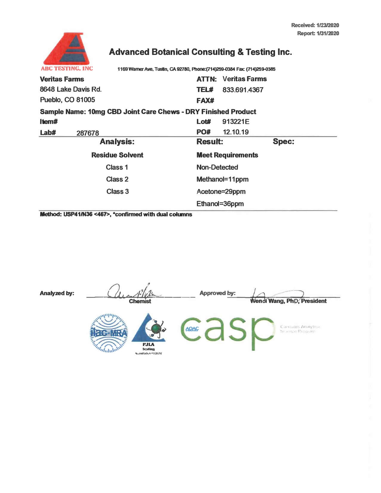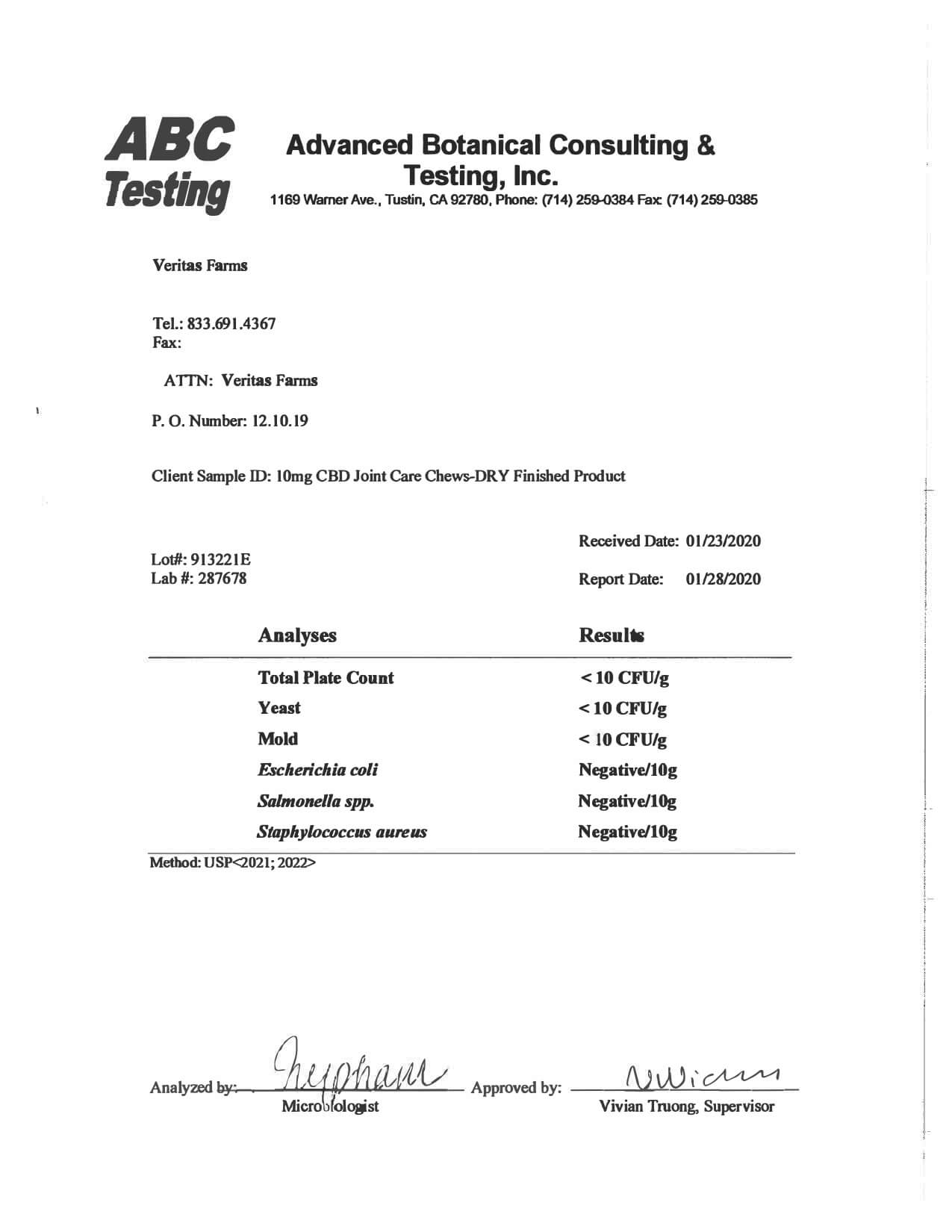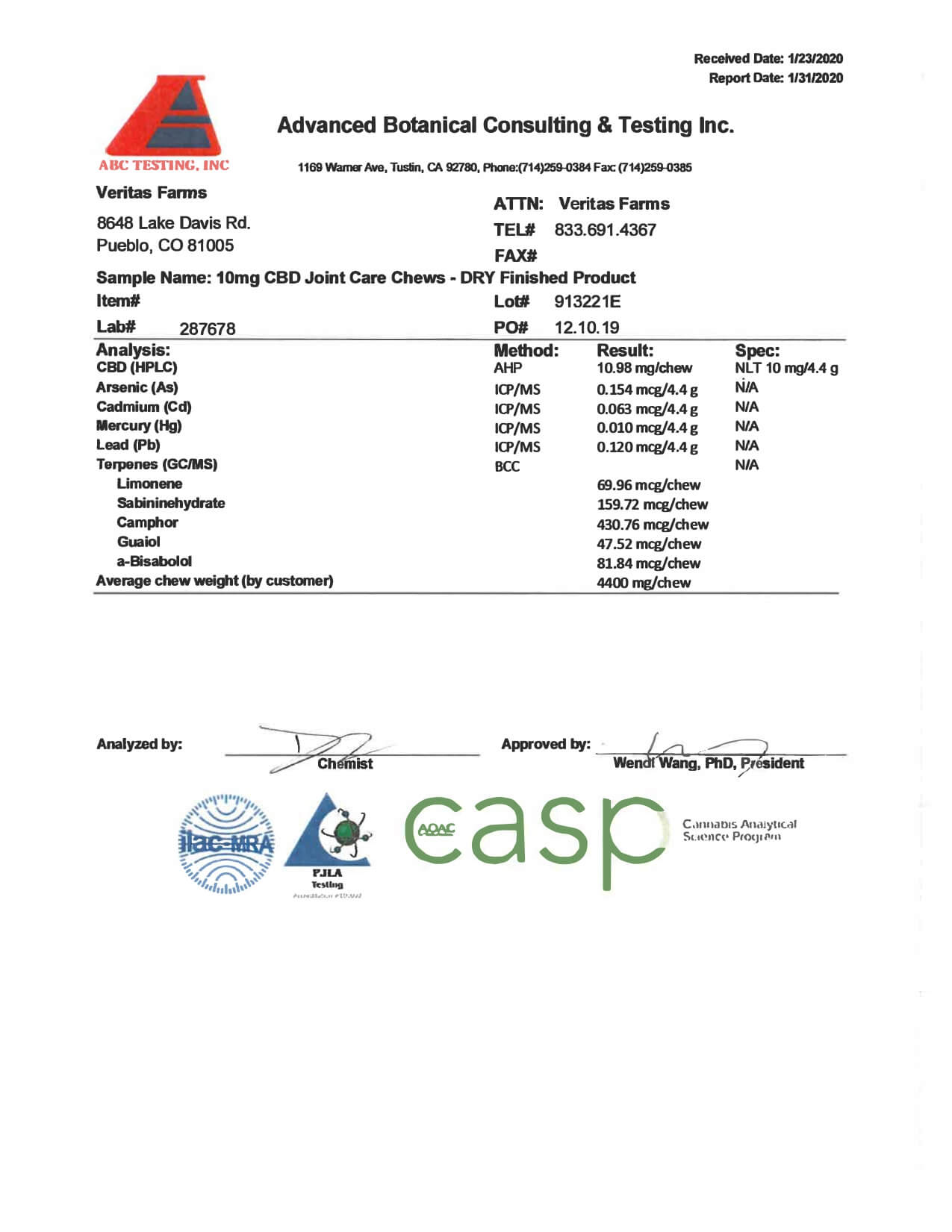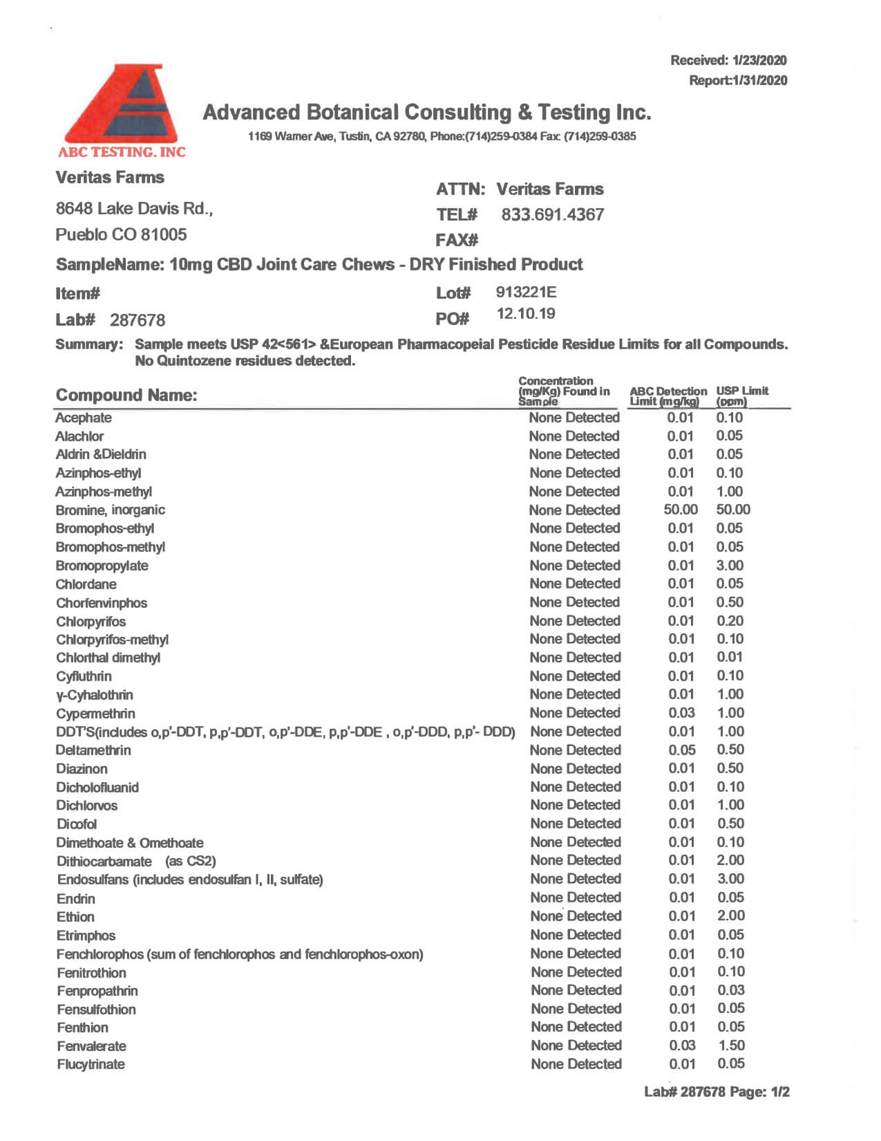Veritas Farms CBD Pet Edible Full Spectrum Joint Care Chews Lab Report important details about vaping products.