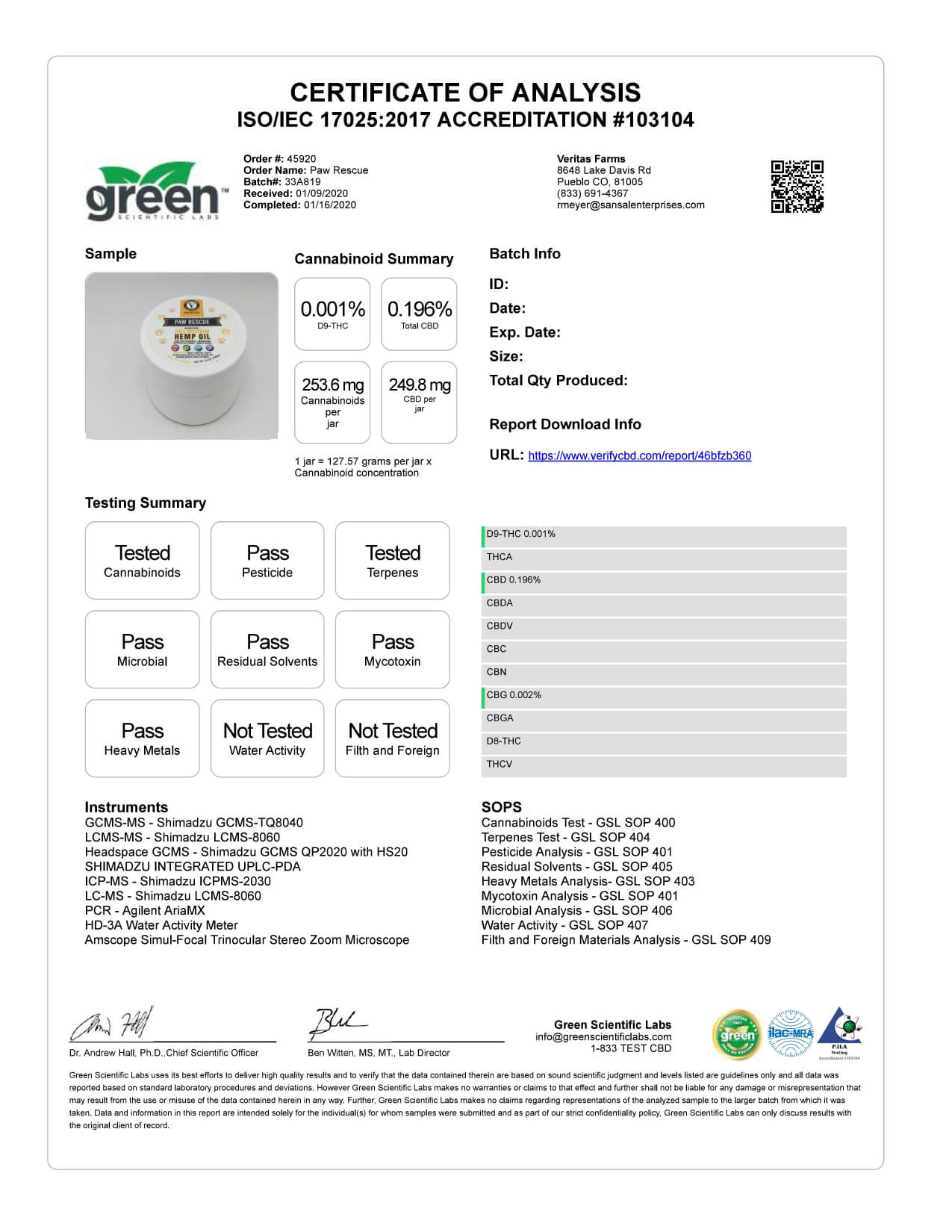 Veritas Farms CBD Pet Topical Full Spectrum Paw Rescue Salve Lab Report important details about vaping products.