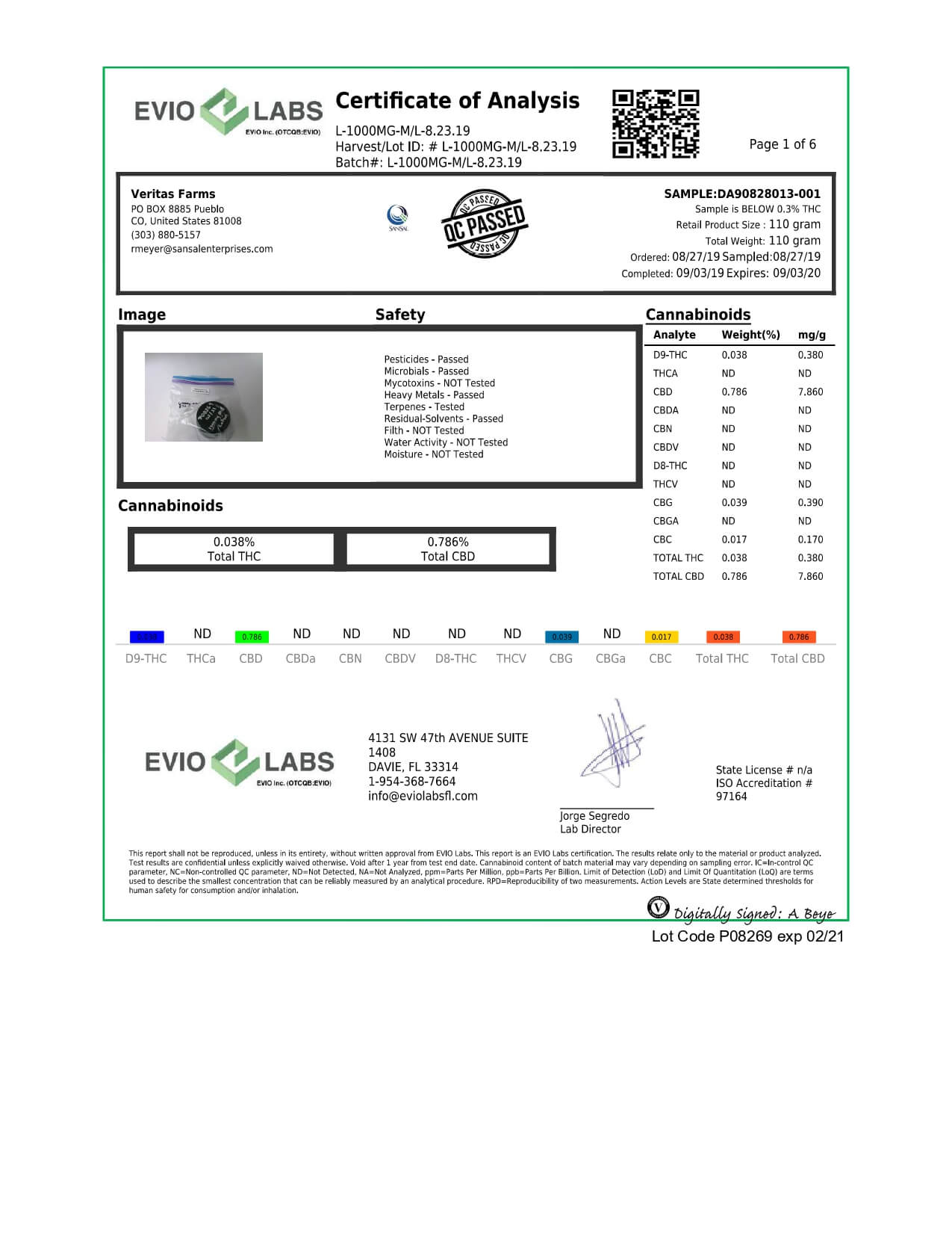 Veritas Farms CBD Topical Full Spectrum Minted Lavender Lotion Lab Report
