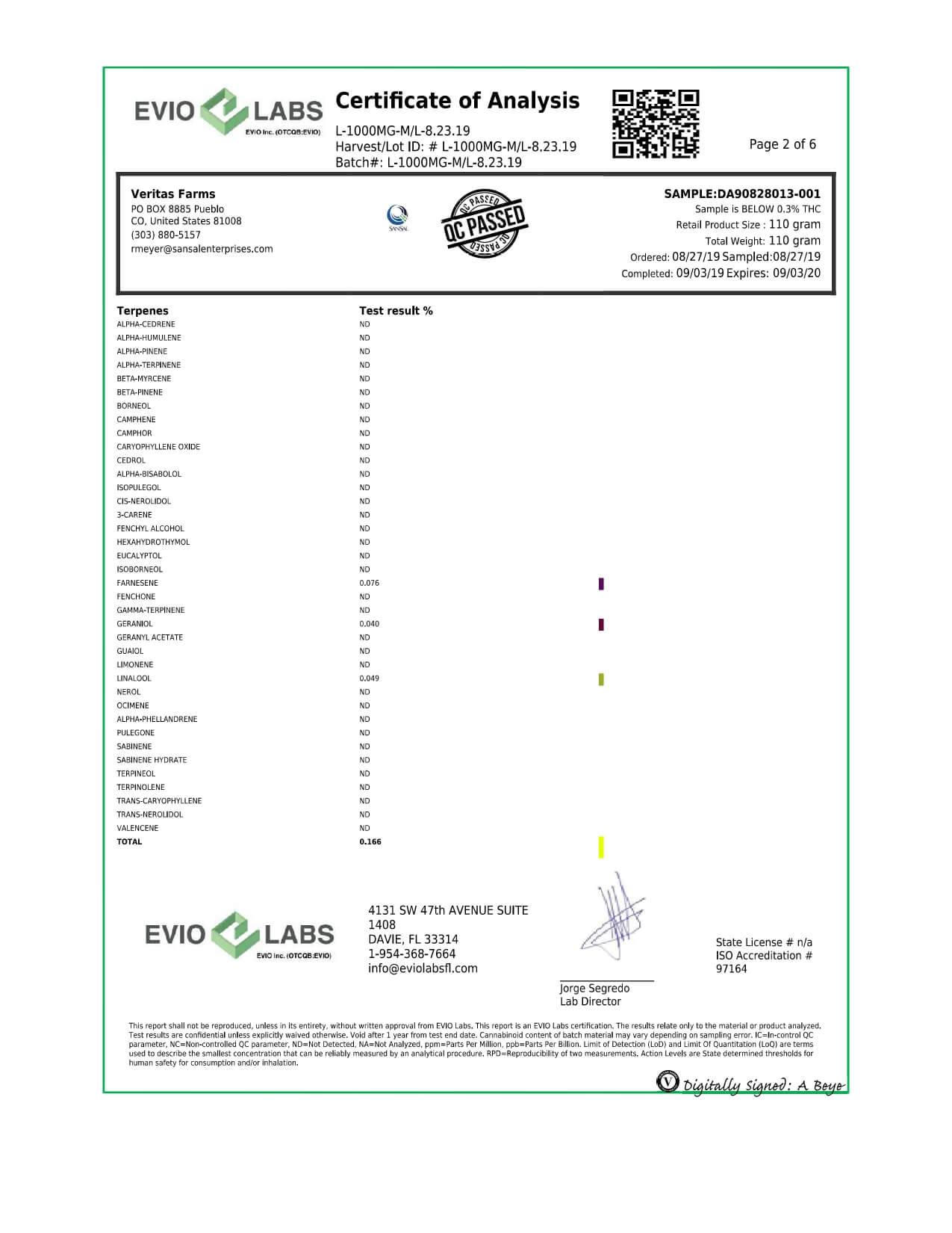 Veritas Farms CBD Topical Full Spectrum Minted Lavender Lotion 1000mg Lab Report