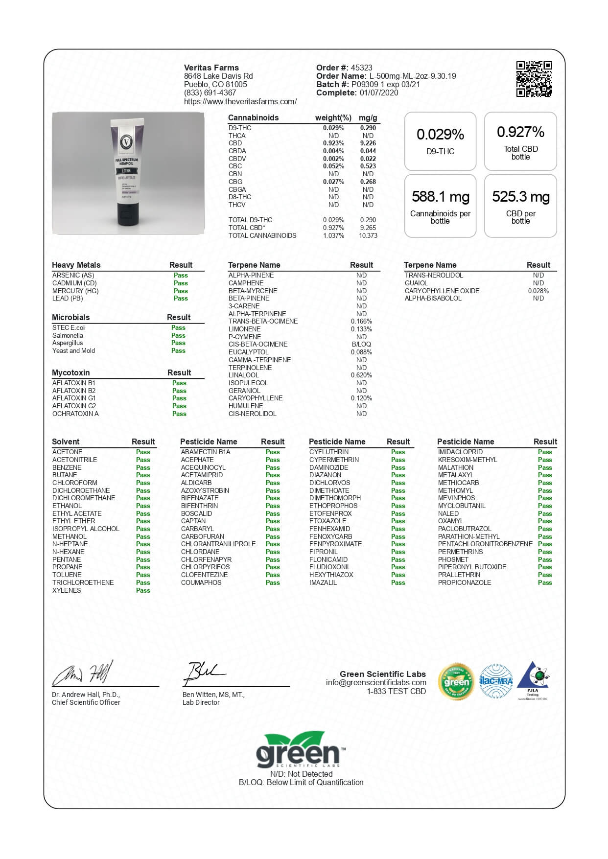 Veritas Farms CBD Topical Full Spectrum Minted Lavender Lotion 500mg Lab Report