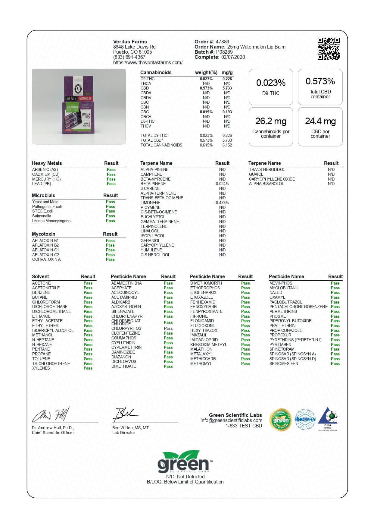 Veritas Farms CBD Topical Full Spectrum Watermelon Lip Balm Lab Report important details about vaping products.